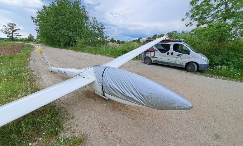 Pomogliśmy z synem wypchnąć szybowiec z pola, a następnie przypięliśmy go do samochodu. Akurat miałem narzędzia i pasy. Szybowiec trzeba było zamocować do samochodu żeby się nie uszkodził podczas burzy.
