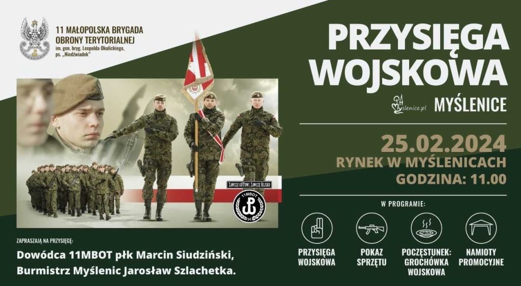W najbliższą niedzielę 25 lutego o godzinie 11.00 na Rynku w Myślenicach 113 kandydatów do służby w szeregach 11 Małopolskiej Brygadzie Obrony Terytorialnej wypowie słowa roty przysięgi wojskowej. Wśród nowych żołnierzy znajdują się także mieszkańcy Powiatu Brzeskiego.