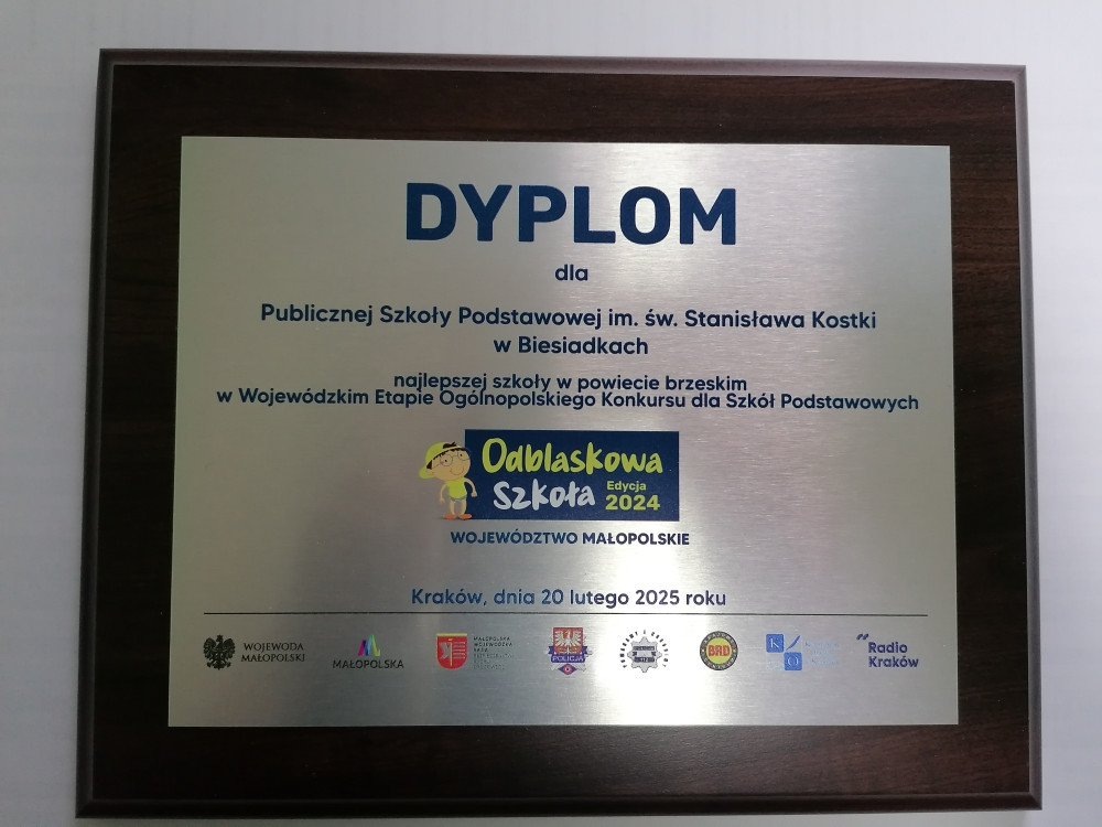 W bieżącym roku szkolnym PSP im. św. Stanisława Kostki w Biesiadkach przystąpiła do Konkursu „Odblaskowa Szkoła” organizowanego przez Wydział Ruchu Drogowego Komendy Wojewódzkiej Policji w Krakowie, Małopolską Wojewódzką Radę Bezpieczeństwa Ruchu Drogowego, Kuratorium Oświaty w Krakowie, Małopolski Urząd Wojewódzki oraz Urząd Marszałkowski Województwa Małopolskiego.