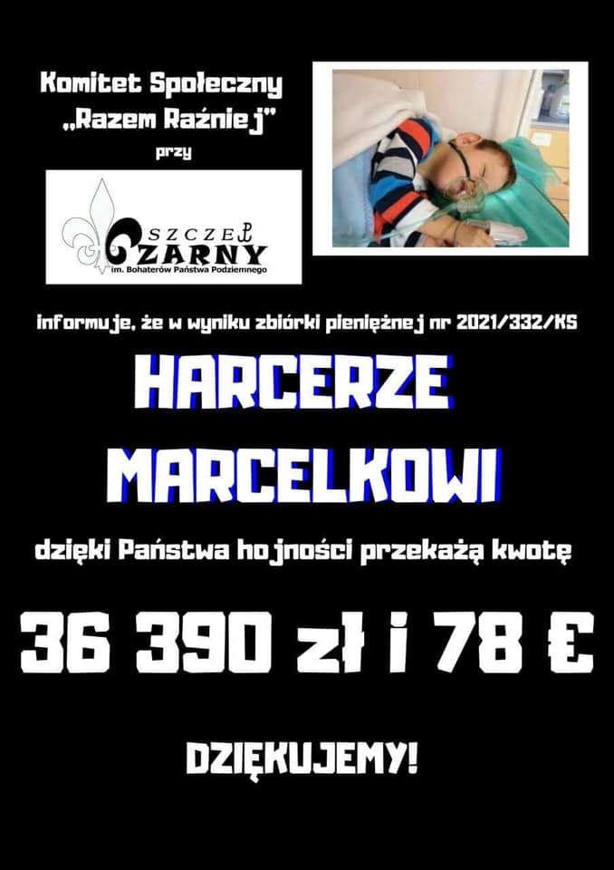 – Na koniec podziękowania dla Darczyńców! Dla wszystkich, którzy wzięliście udział w akcji zapełniania naszych puszek! Za każdą złotówkę i za tą pięćsetkę również! Dziękujemy za olbrzymią hojność i za zaufanie. W najbliższych dniach cała zebrana kwota zostanie wpłacona na konto bankowe rodziców Marcelka i mamy nadzieję pomoże w leczeniu chłopca – dodaje phm. Bartłomiej Turlej.