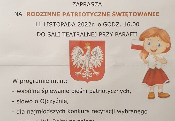 Grupa Teatralna serdecznie zaprasza wszystkich 11 listopada na wspólne patriotyczne świętowanie. Rozpoczęcie o godz. 16.00 w sali teatralnej przy naszej parafii. W programie m.in.: wspólne śpiewanie pieśni patriotycznych, słowo o Ojczyźnie czy konkurs recytatorski dla najmłodszych.