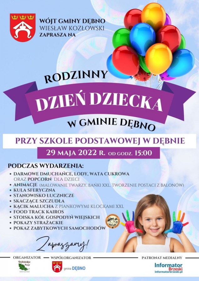 W niedzielę 29 maja 2022 r. wójt Gminy Dębno Wiesław Kozłowski serdecznie zaprasza na Rodzinny Dzień Dziecka w Gminie Dębno. Impreza rozpocznie się o godzinie 15 przy szkole podstawowej w Dębnie.