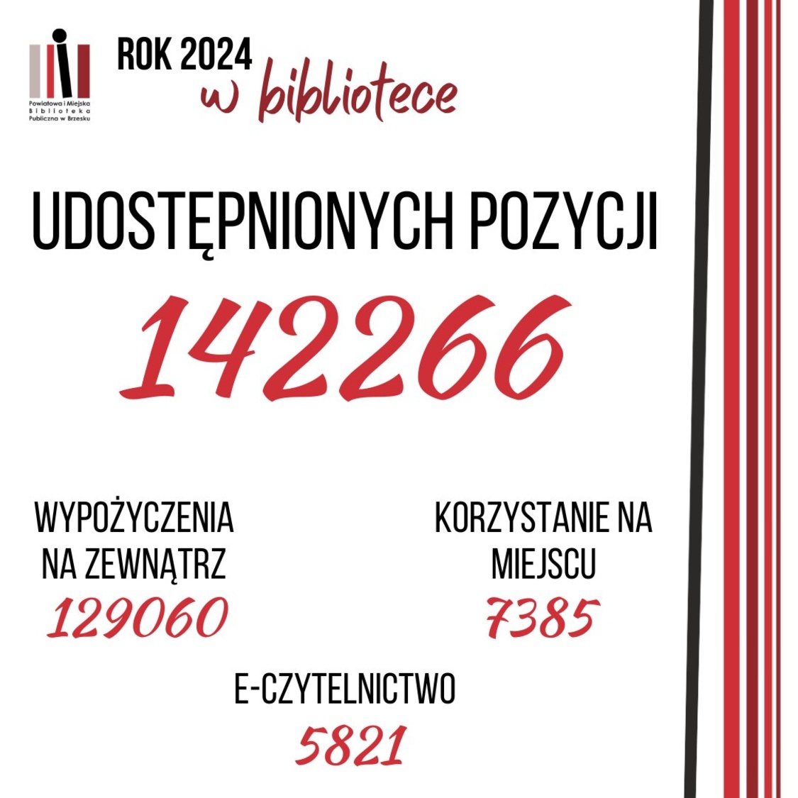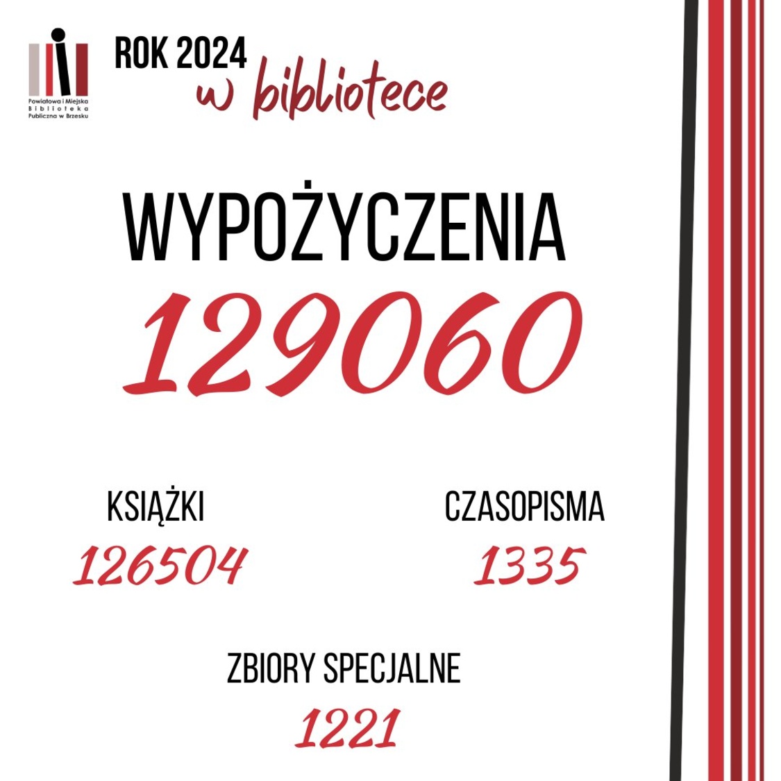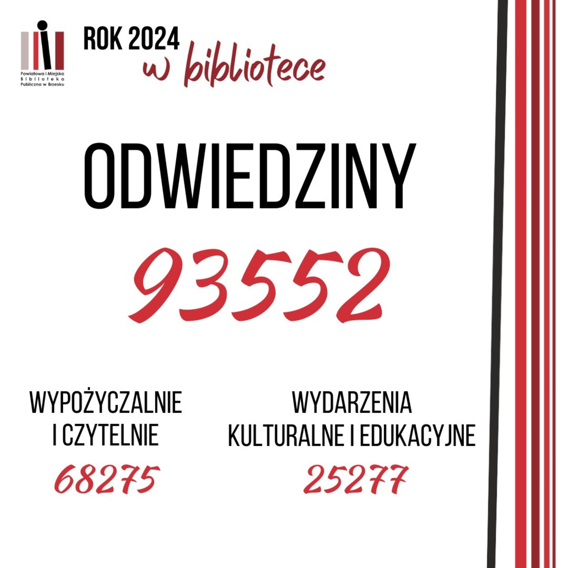 Dla brzeskiej biblioteki był rok pełen wyzwań, ale i wielu pięknych chwil. Wyjątkowe spotkania autorskie, warsztaty i wydarzenia kulturalne przyciągnęły wielu miłośników literatury. Zrealizowaliśmy bardzo ciekawe projekty i nawiązaliśmy wartościowe współprace. Młodsi odbiorcy doskonale bawili się na zajęciach kreatywnych oraz zdobywali nową wiedzę i umiejętności na zajęciach stałych. To wszystko znalazło swoje odzwierciedlenie także w liczbach. W 2024 roku PiMBP w Brzesku, a zatem siedzibę główną w Brzesku oraz 5 filii w Jadownikach, Mokrzyskach, Okocimiu, Porębie Spytkowskiej i Szczepanowie, odwiedziły w sumie 93552 osoby, z czego wypożyczalnie i czytelnie 68275 osób, a 25277 osób wzięło udział w wydarzeniach kulturalnych i edukacyjnych organizowanych przez bibliotekę.