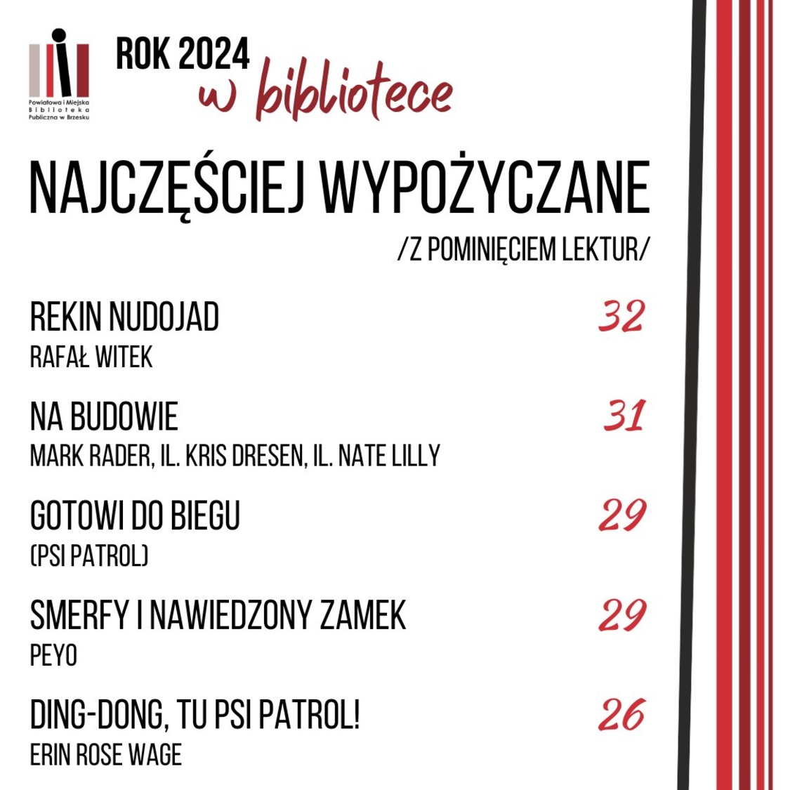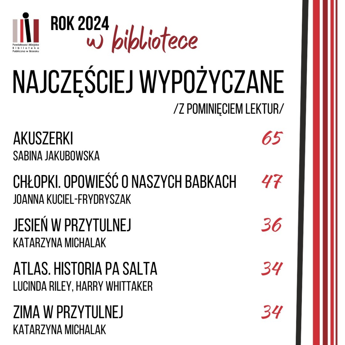 Tradycją jest już także, by sprawdzać, jaka pozycja była najchętniej wypożyczana. Na szczycie zestawienia od swojej premiery nieprzerwanie znajdują się oczywiście „Akuszerki” Sabiny Jakubowskiej, wysoko także „Dom na Wschodniej”. Drugie miejsce należy do „Chłopek” Joanny Kuciel-Frydryszak, którą gościliśmy w brzeskiej bibliotece w 2024 roku. Ten wybór czytelniczek i czytelników nie dziwi, jest to również pozycja, na którą obecnie czeka w kolejce najwięcej osób. Hitem tego roku okazała się także najnowsza seria powieści Katarzyny Michalak „Saga Przytulna”, której wszystkie części cieszyły ponad 30-krotnymi wypożyczeniami. W zestawieniu znalazły się też inne, lubiane od lat autorki: Lucinda Riley (z wydanym już po jej śmierci, finałowym tomem sagi „Siedem sióstr”), Krystyna Mirek oraz Joanna Tekieli.