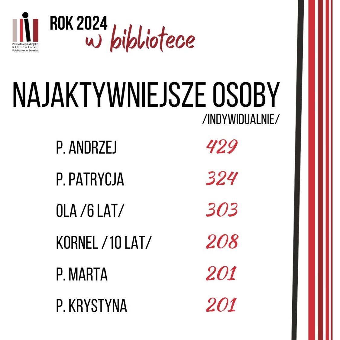 Zainteresowanie i podziw budzi zawsze także zestawienie najaktywniejszych czytelników i czytelniczek. Przyznać trzeba, że grono wypożyczających w PiMBP w Brzesku odznacza się dużą pilnością i chociaż oczywiście różne są zainteresowania i możliwości czytelnicze, to wart uznania jest każdy taki zwrot ku literaturze. Rekordzistą pod kątem ilości wypożyczonych książek jest stały czytelnik Działu Dorosłych pan Andrzej z wynikiem aż 429 książek! Na szczycie zestawienia znalazł się już po raz kolejny, tym razem jednak z o niemal 100 większą liczbą wypożyczeń. Druga lokata z również imponującą pulą 324 książek należy do pani Patrycji, która korzysta z wypożyczalni Działu Dorosłych, Oddziału dla Dzieci oraz filii w Mokrzyskach. Bardzo pilni są także młodzi czytelnicy: 6-letnia Ola, która w Oddziale dla Dzieci i filii w Jadownikach wypożyczyła 303 książki oraz 10-letni Kornel, który zapracował na wynik 208 książek (z Oddziału dla Dzieci). Swoje stałe i bardzo aktywne czytelniczki mają także filie w Porębie Spytkowskiej – pani Marta oraz w Okocimiu – pani Krystyna, obie w minionym roku wypożyczyły po 201 książek.