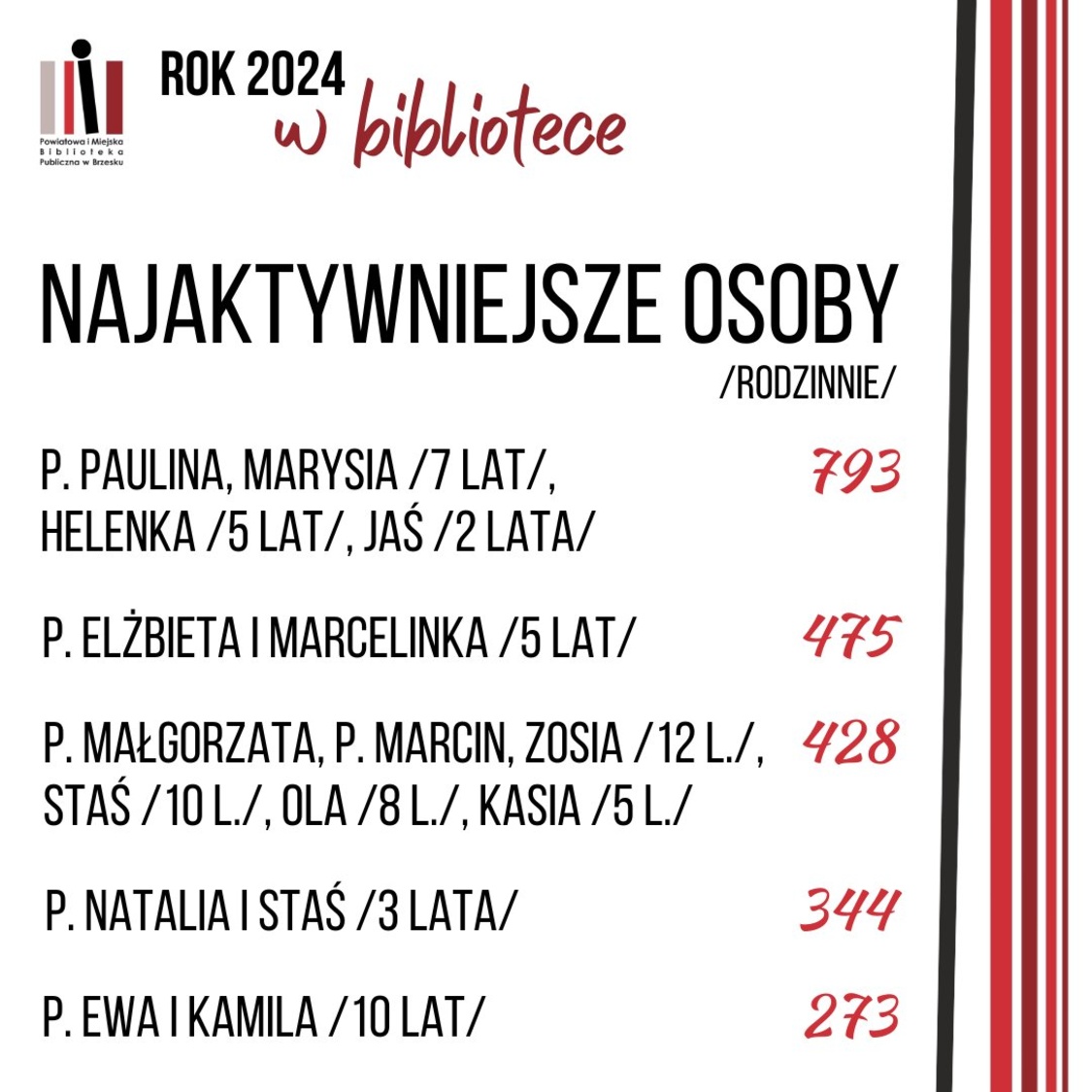 Na osobne omówienie zasługują bez wątpienia również czytające rodziny, gdzie dzieciom wypożyczającym w dedykowanej im wypożyczalni Oddziału dla Dzieci towarzyszą także rodzice, w niektórych przypadkach również sami będący aktywnymi czytelnikami. Wspaniały wynik 793 wypożyczonych książek osiągnęła rodzina pani Pauliny, 7-letniej Marysi, 5-letniej Helenki i 2-letniego Jasia. Pani Elżbieta wraz z 5-letnią córką Marcelinką, które korzystają również ze zbiorów w filii w Jadownikach, wypożyczyły 475 pozycji. Rodzina państwa Małgorzaty i Marcina wraz z 12-letną Zosią, 10-letnim Stasiem, 8-letnią Olą i 5-letnią Kasią wypożyczyła 428 książek, w tym także w formie audiobooków z Działu Multimedialnego. Pani Natalia z 3-letnim synkiem Stasiem sięgnęli po 344 książki, zaś pani Ewa i jej 10-letnia córka Kamila po 273. Wszystkim czytelniczkom i czytelnikom serdecznie gratulujemy ich wyników, ciesząc się, że pozostają wierni swojej pasji czytania i rozbudzają ją także w kolejnych pokoleniach.