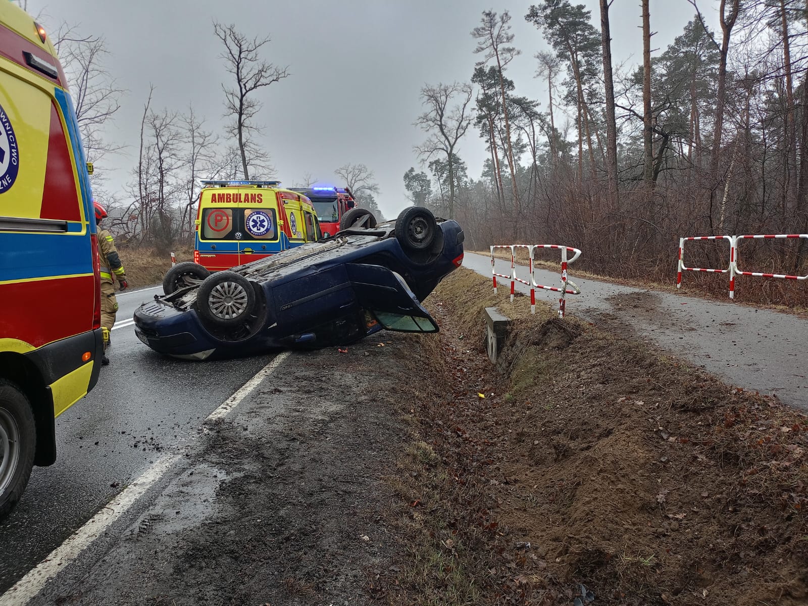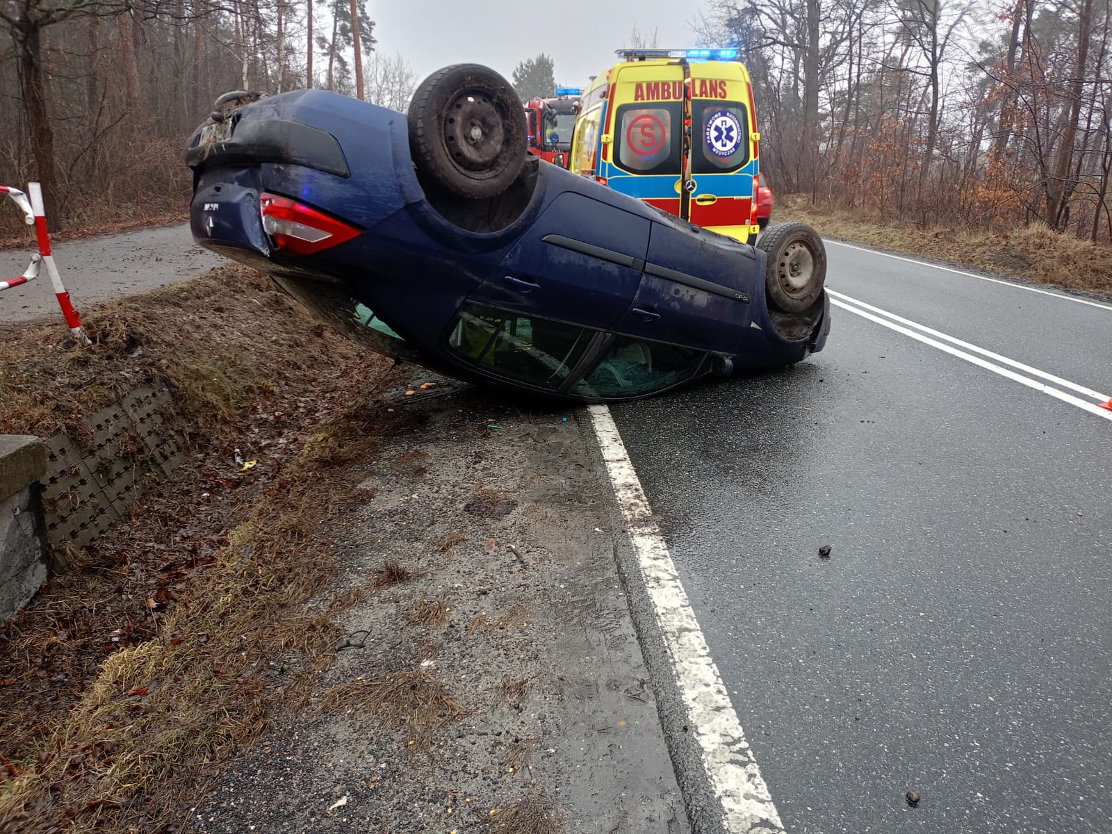 Kierujący pojazdem stracił panowanie nad pojazdem po tym jak na drogę wybiegło mu dzikie zwierzę, w efekcie doszło do dachowania pojazdu.