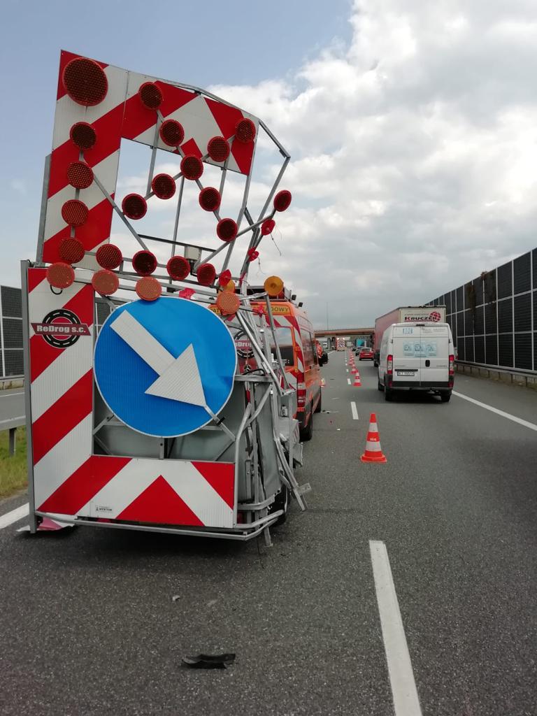 Samochód dostawczy najechał na jeden z zestawów zabezpieczających prace konserwacyjne na obiekcie mostowym. Prawdopodobnie kierowca samochodu dostawczego nie zachował należytej ostrożności i uderzył w zestaw zabezpieczający. Na szczęście nikt nie został poszkodowany, a obeszło się jedynie na uszkodzeniu przyczepy sygnalizacyjno – ostrzegawczej.