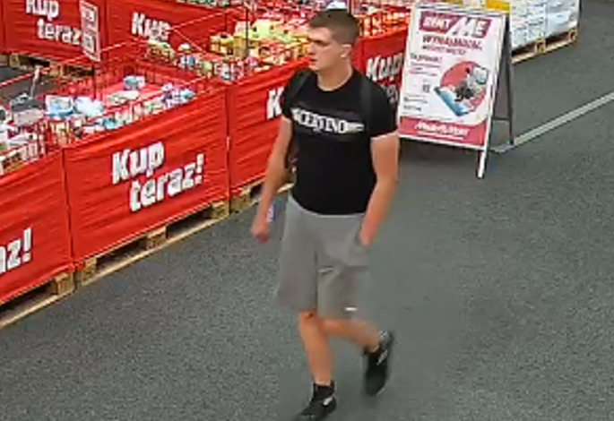 Widoczny na zdjęciu mężczyzna podejrzewany jest kradzież telefonu komórkowego firmy Apple iPhone 12 kolor Green 64Gb o wartości blisko 3300 złotych. Widoczny na zdjęciach mężczyzna w dniu 27.08.2023 roku wynosi ze sklepu w Tarnowie przy ul. Nowodąbrowskiej skradziony telefon przechodząc przez bramki zabezpieczające.