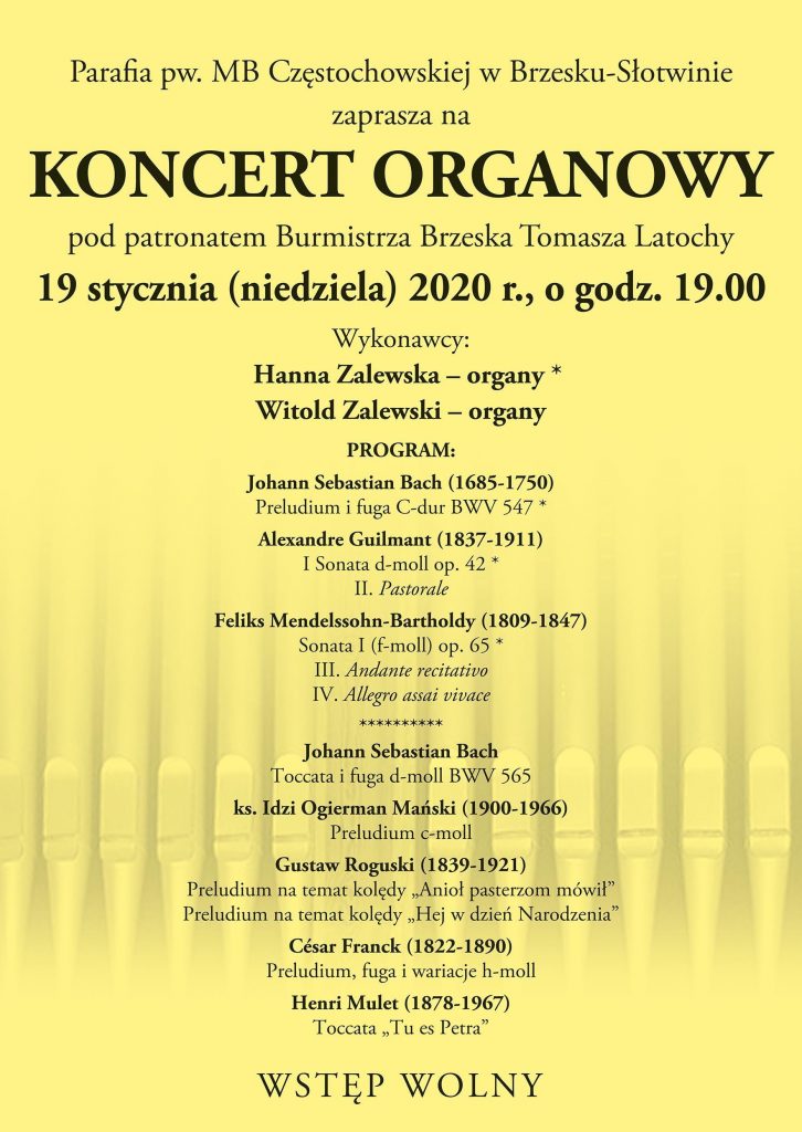 Już w najbliższą niedzielę 19 stycznia 2020 r. o godz. 19.00 Parafia pw. MB Częstochowskiej w Brzesku-Słotwinie zaprasza na Koncert Organowy. Wstęp wolny.