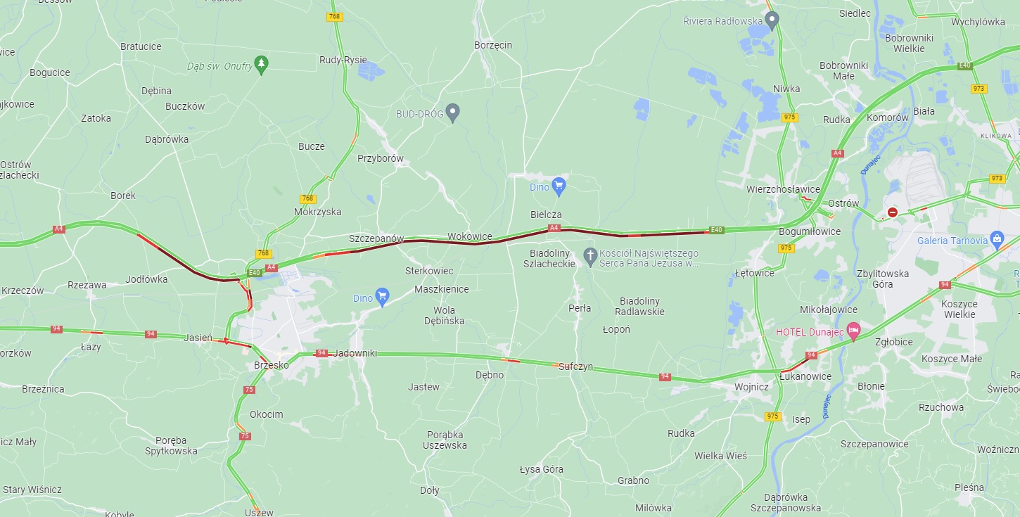 Mapa natężenia ruchu na autostradzie A4 – 29 lipca 2022 r. godz. 17.30
