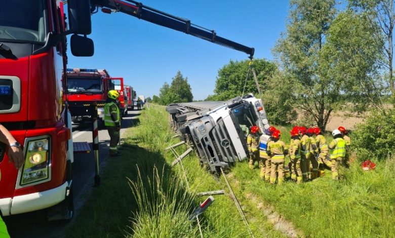 Ze wstępnych informacji wynika, że kierujący samochodem ciężarowym przejechał na przeciwległy pas, otarł się o tył nadjeżdżającej z naprzeciwka ciężarówki, a następnie samochód przewrócił się do rowu.
