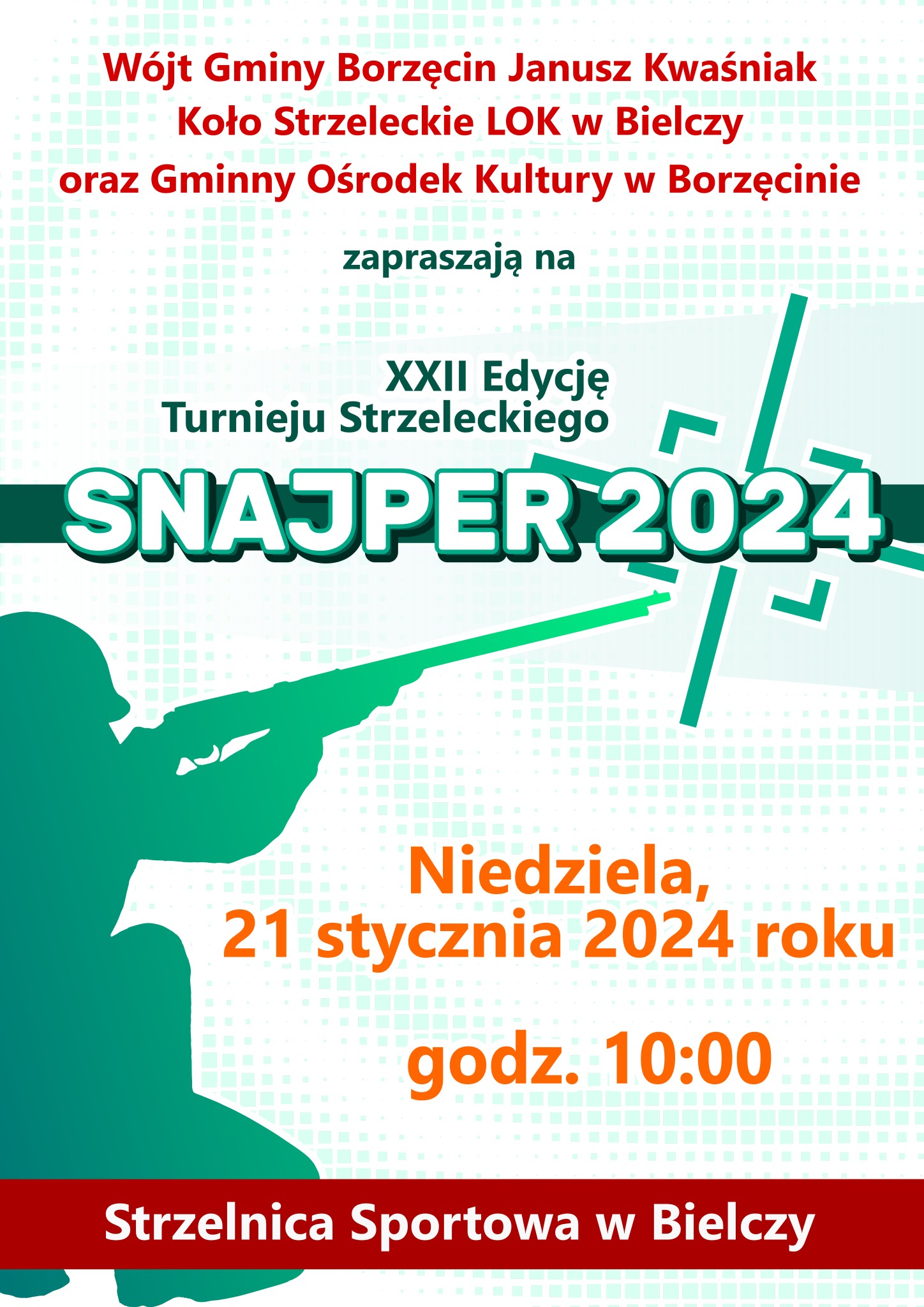 W najbliższą niedzielę 21 stycznia 2024 roku na strzelnicy sportowej w Bielczy (tzw. „Piekiełko”) odbędą się zawody strzeleckie „Snajper 2024″ o Puchar i nagrody wójta gminy Borzęcin – Janusza Kwaśniaka. Organizowany w tym roku po raz dwudziesty drugi turniej od wielu lat cieszy się niesłabnącą popularnością. Po kilku letniej przerwie turniej powrócił do kalendarza wydarzeń strzeleckich w Powiecie Brzeskim w ubiegłym roku w wakacje. W tym roku turniej odbędzie się już w tradycyjnej, zimowej formie. Rywalizacja będzie odbywać się na bieleckim „Piekiełku” od godz. 10.00.