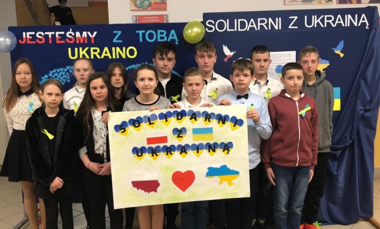 Na stelażach pojawiły się plakaty wykonane przez uczniów klas 5-8, głoszące solidarność z Ukrainą i potępiające wojnę w ogóle. Młodsze dzieci wykonały piękne laurki, które przepełnione były współczuciem i troską o los ich ukraińskich rówieśników. Na innym stelażu z kolei zamieszczono ogromne serce utworzone z małych żółtych i niebieskich serduszek, przypinanych przez wszystkich uczniów na znak solidaryzowania się z narodem ukraińskim, a w szczególności z każdym ukraińskim dzieckiem.