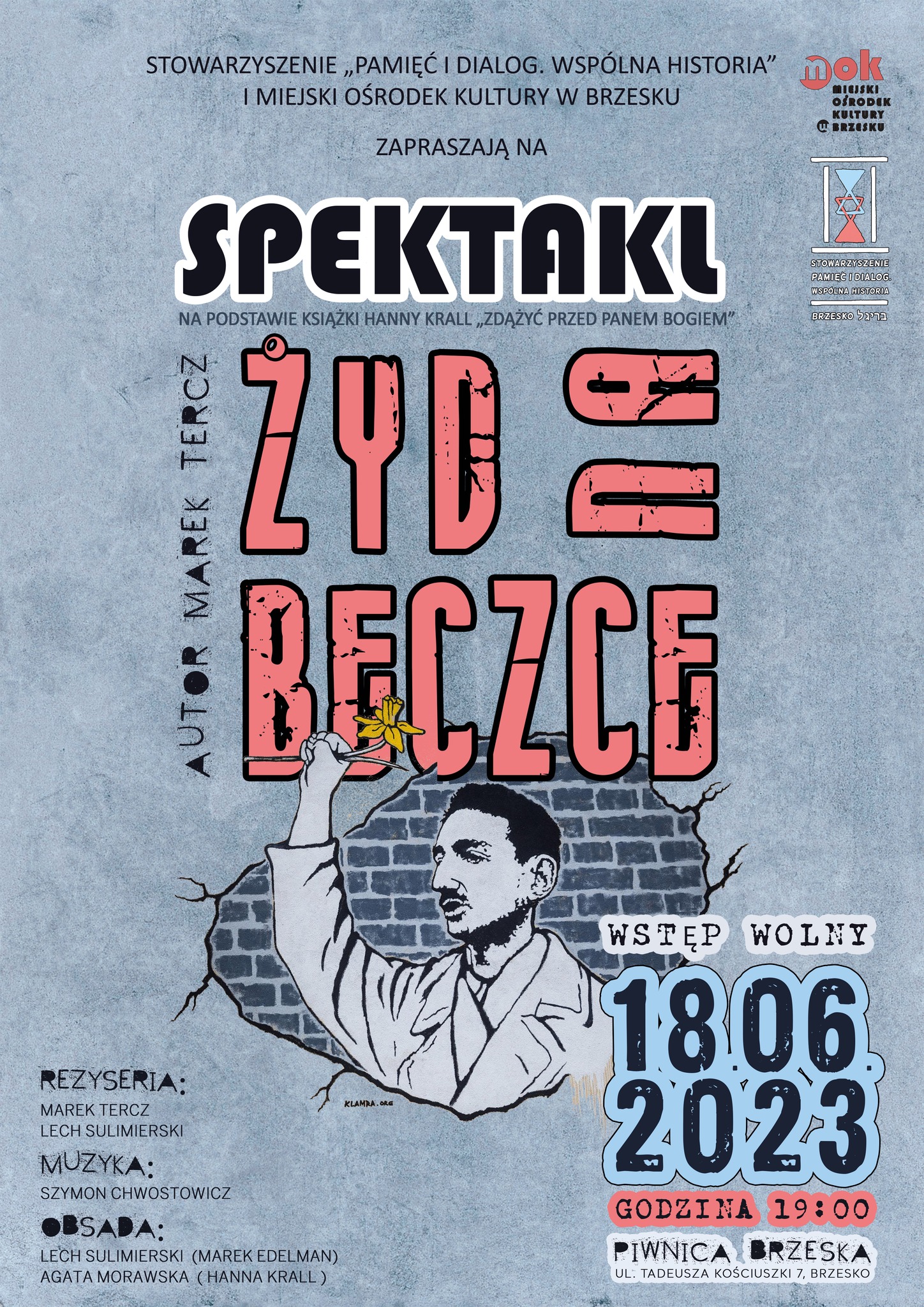W niedzielę 18 czerwca 2023 r., o godz. 19.00 stowarzyszenie „Pamięć i dialog. Wspólna historia” oraz Miejski Ośrodek Kultury w Brzesku zapraszają wszystkich do Piwnicy Brzeskiej (ul. Tadeusza Kościuszki, 7) na spektakl „Żyd na beczce” na podstawie książki Hanny Krall „Zdążyć przed Panem Bogiem”.
