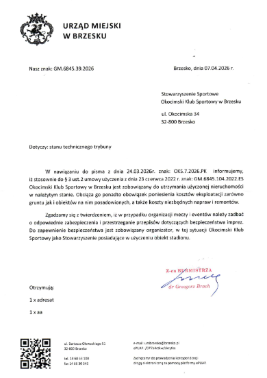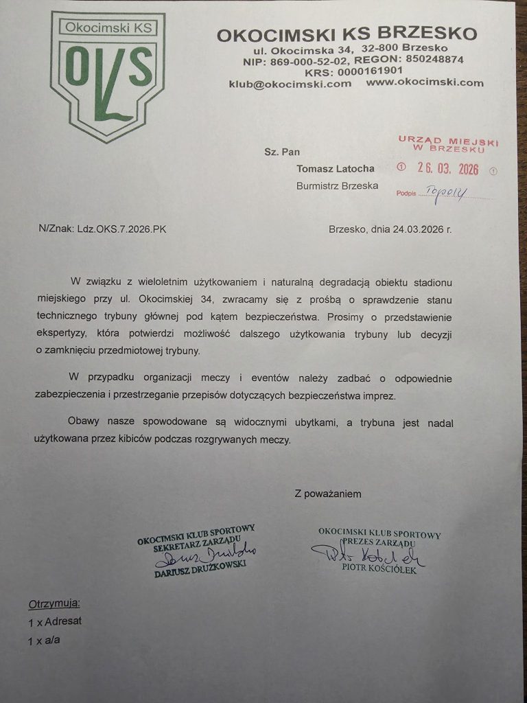 Stan techniczny stadionu OKS oraz infrastruktury budzi od lat zmartwienie wśród działaczy sportowych, zawodników, jak i sympatyków klubu. Sprawa głównej trybuny stadionu miejskiego w Brzesku nabrała tempa pod koniec marca. 24 marca 2026 r. Okocimski Klub Sportowy w Brzesku skierował do Urzędu Miejskiego w Brzesku oficjalne pismo, w którym zwrócił się z wnioskiem o sprawdzenie stanu technicznego stadionu przy ul. Okocimskiej pod kątem bezpieczeństwa.