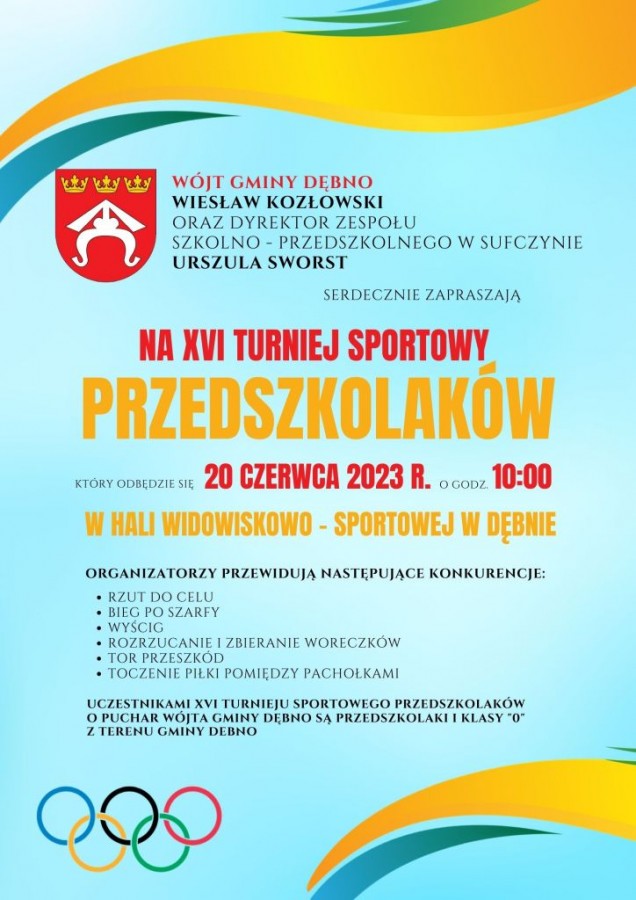 Serdecznie zapraszamy na XVI Turniej Sportowy Przedszkolaków, który odbędzie się, już w najbliższy wtorek 20 czerwca 2023 r. o godz. 10:00 na Hali Widowiskowo – Sportowej w Dębnie. Honorowy Patronat nad turniejem objął Wójt Gminy Dębno Wiesław Kozłowski.