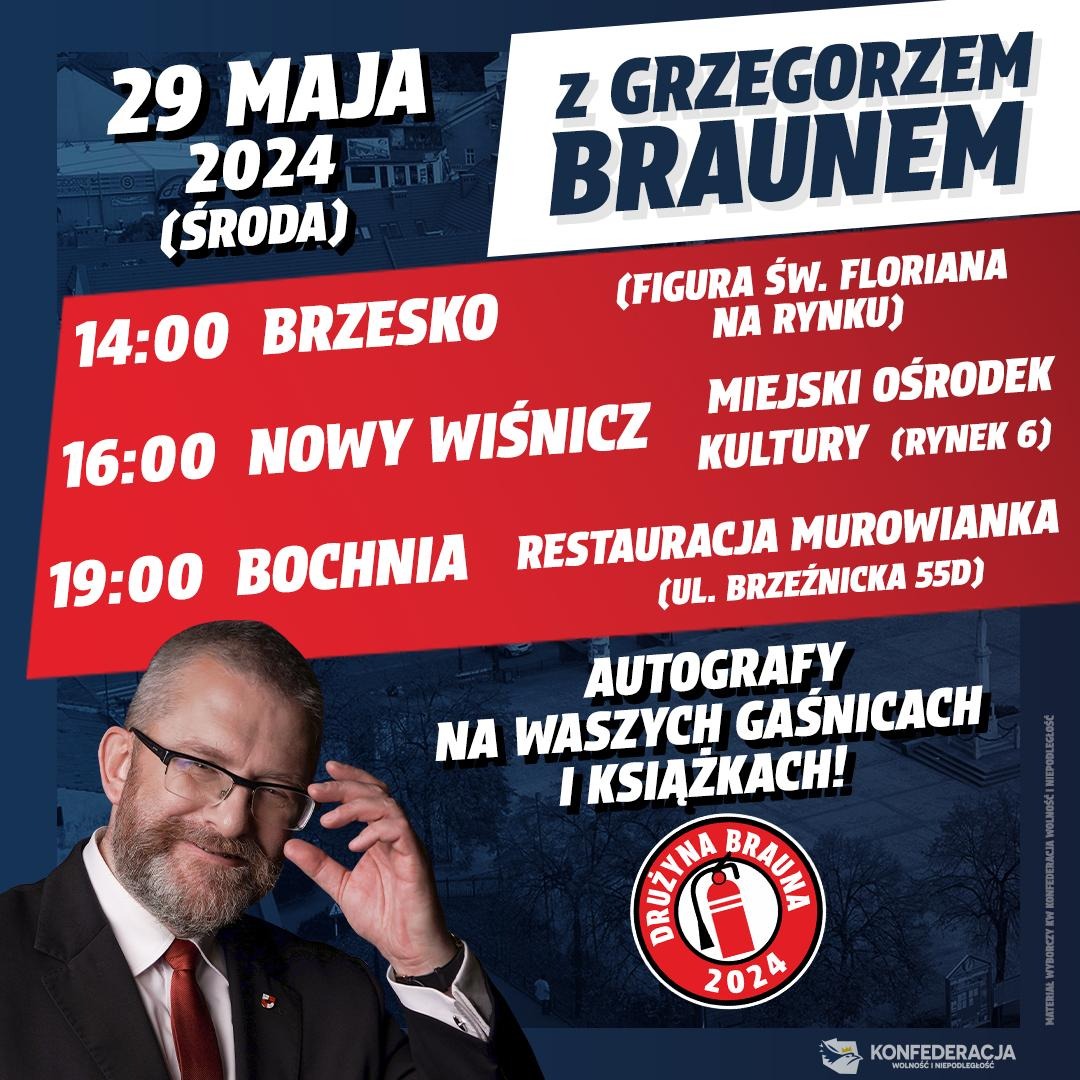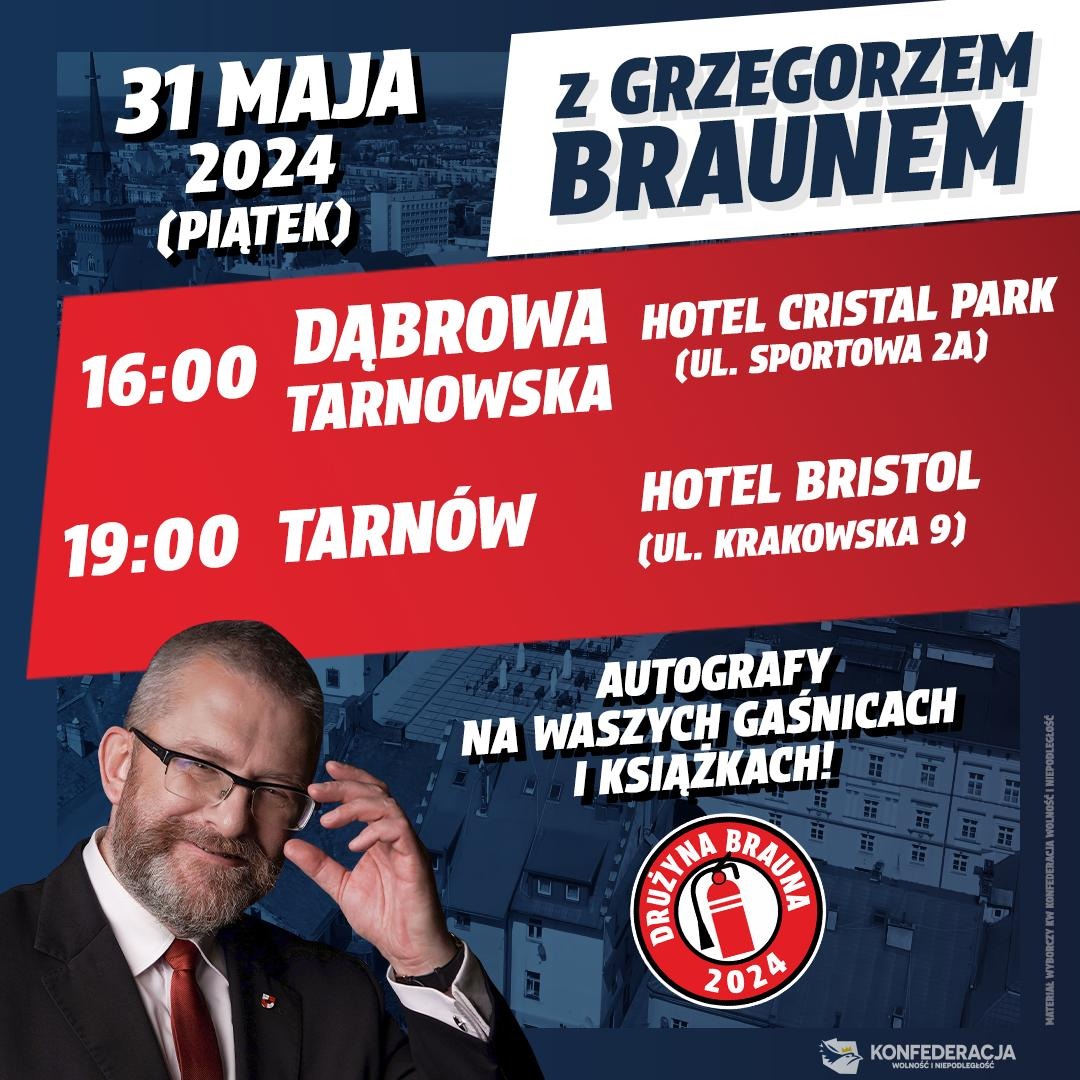 Serdecznie zapraszamy na spotkania wyborcze z Panem Posłem Grzegorzem Braunem, który kandyduje z miejsca nr 2 do Parlamentu Europejskiego z Komitetu Wyborczego Konfederacja Wolność i Niepodległość (lista nr 2).