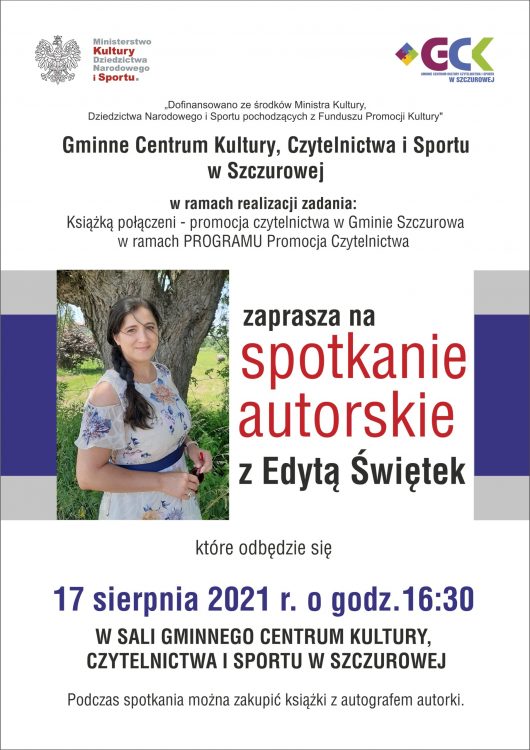 W najbliższy wtorek 17 sierpnia 2021r., o godz.16:30 w sali widowiskowej Gminnego Centrum Kultury Czytelnictwa i Sportu odbędzie się spotkanie autorskie z Edytą Świętek. Podczas spotkania pisarka opowie zebranym o swoim życiu, pasji tworzenia, o tym, jak powstają jej książki. Wstęp na spotkanie – wolny. Warto się wybrać!