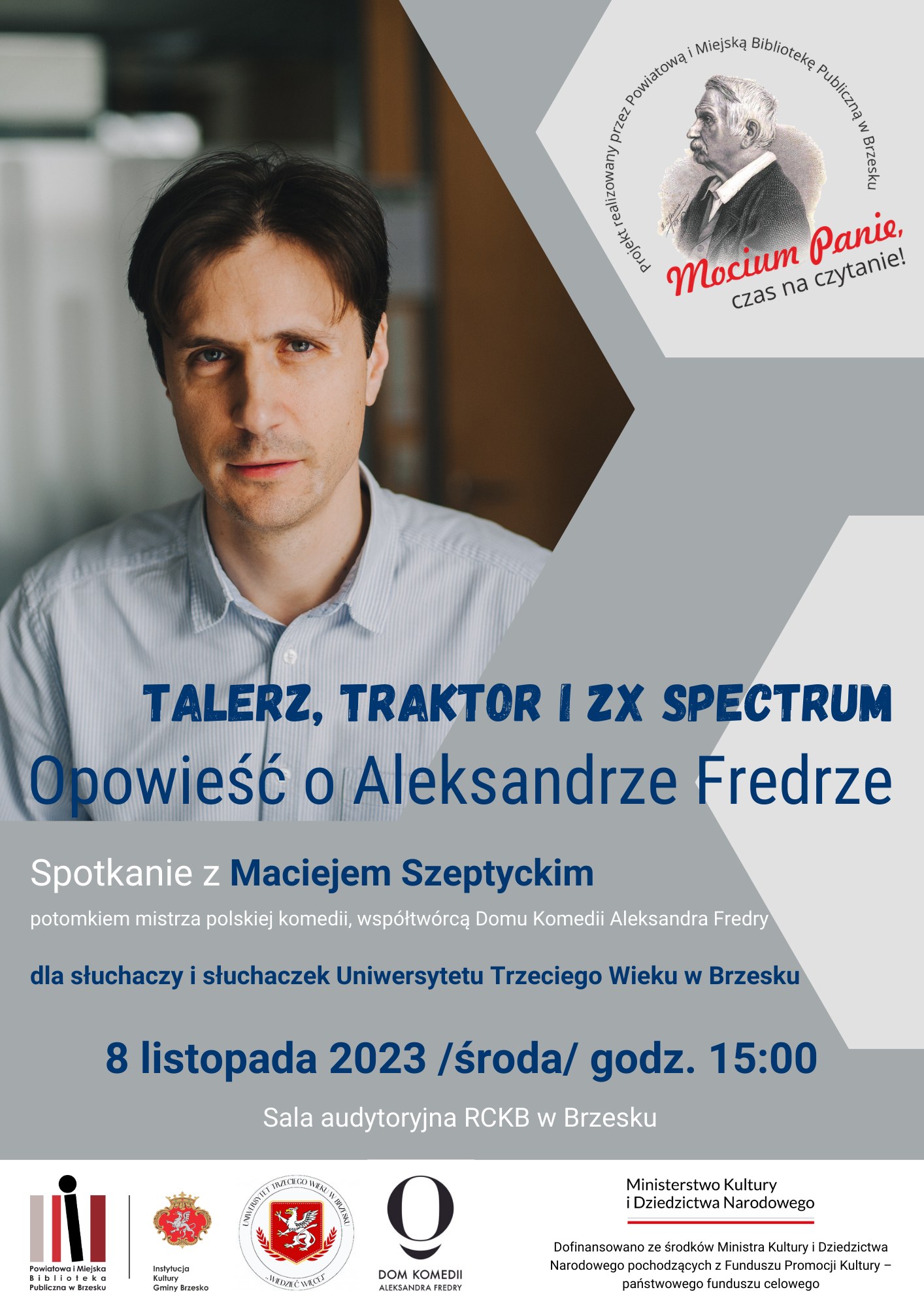 Słuchaczy i słuchaczki oraz wszystkie osoby sympatyzujące z Uniwersytetem Trzeciego Wieku w Brzesku zapraszamy na spotkanie z Maciejem Szeptyckim – potomkiem mistrza polskiej komedii Aleksandra Fredry – o tajemniczo brzmiącym tytule „Talerz, traktor i ZX Spectrum. Opowieść o Aleksandrze Fredrze”.