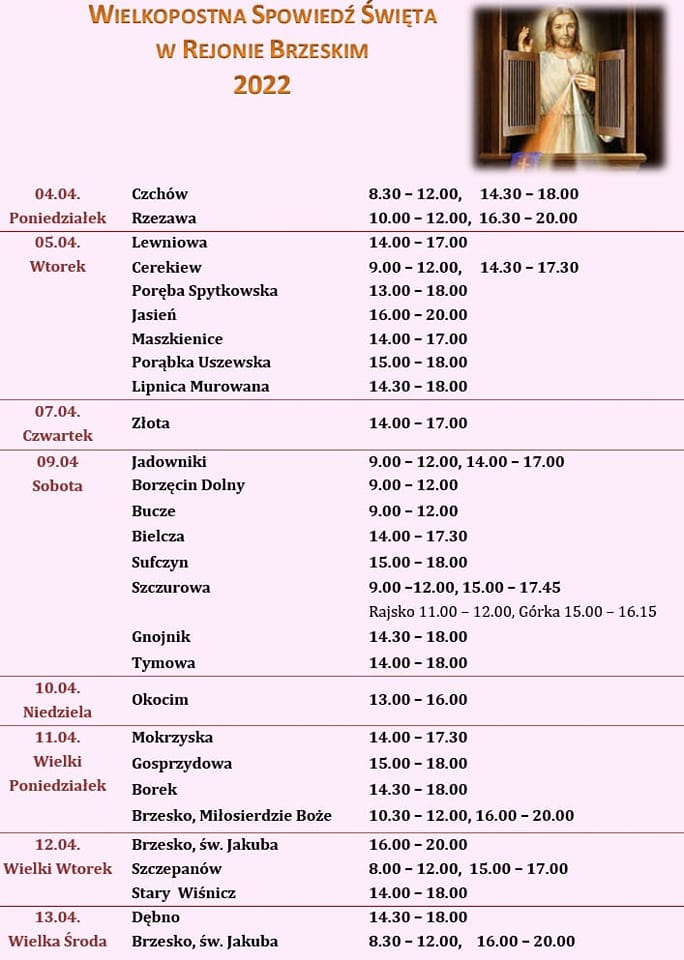 Harmonogram spowiedzi w parafiach w Powiecie Brzeskim przedstawia się następująco: