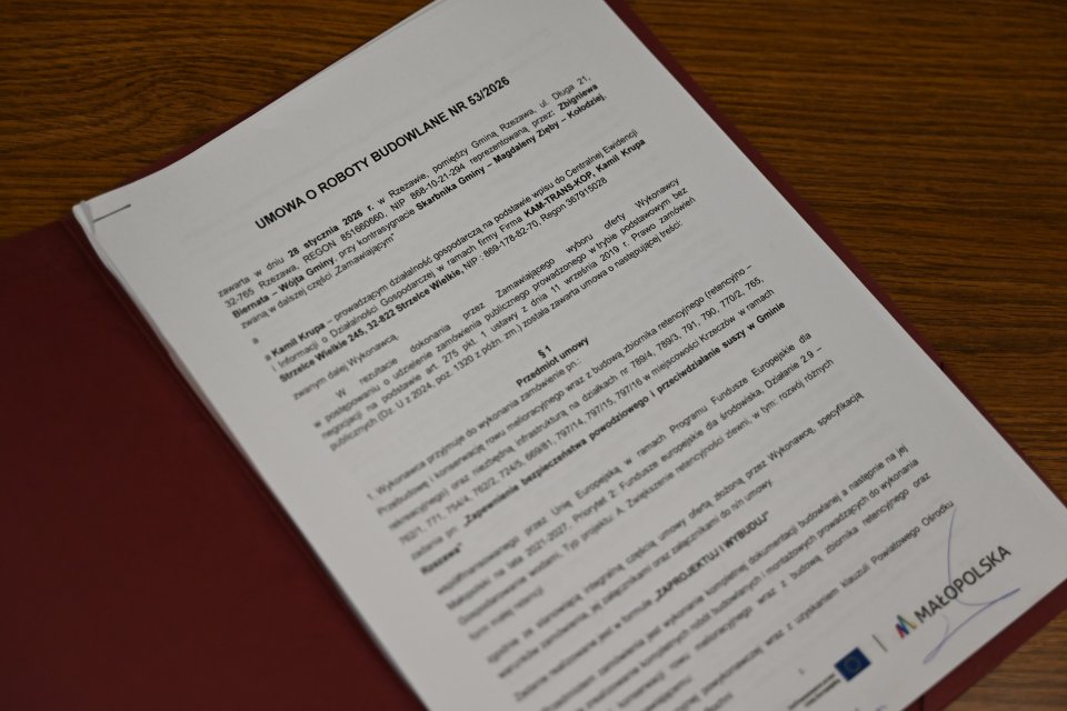 Podpisano umowę na budowę zbiornika małej retencji w Krzeczowie. Wartość inwestycji wynosi blisko 700 tys. zł, z czego 85 procent stanowi dofinansowanie z programu Fundusze Europejskie dla Małopolski 2021–2027.