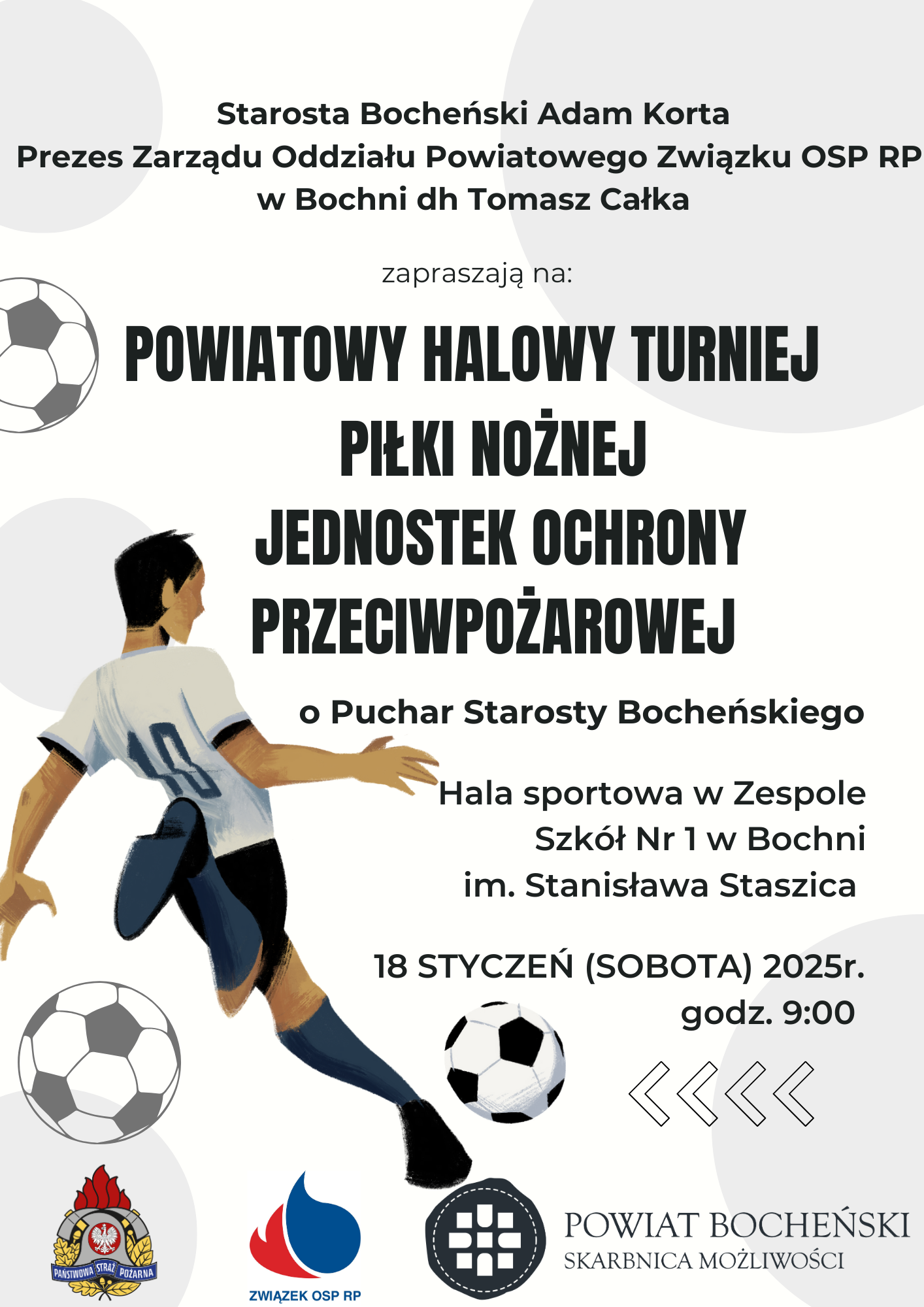 Czy strażacy to tylko mistrzowie gaszenia pożarów? Zdecydowanie nie! Już w sobotę, 18 stycznia 2025 roku, pokażą, że równie dobrze radzą sobie na boisku piłkarskim. Wszystko za sprawą Powiatowego Halowego Turnieju Piłki Nożnej Jednostek Ochrony Przeciwpożarowej, który odbędzie się w hali sportowej Zespołu Szkół Nr 1 w Bochni im. Stanisława Staszica. Startujemy punktualnie o 9:00!