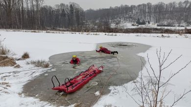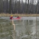 Strażacy przećwiczyli techniki ratowania osób tonących w wyniku załamania się tafli lodu na zbiorniku wodnym, zasady bezpieczeństwa pracy na zamarzniętych akwenach, ewakuację osób tonących z zastosowaniem sprzętu ratowniczego i technik ratowniczych.