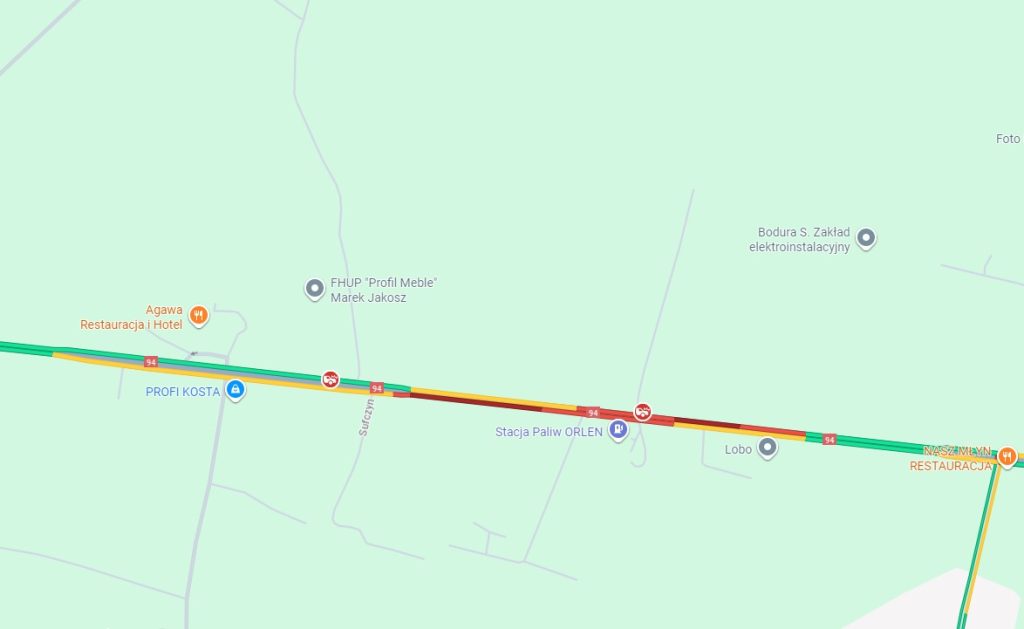Mapa natężenia ruchu – DK 94 / 11 grudnia 2025 r. godz. 13.11