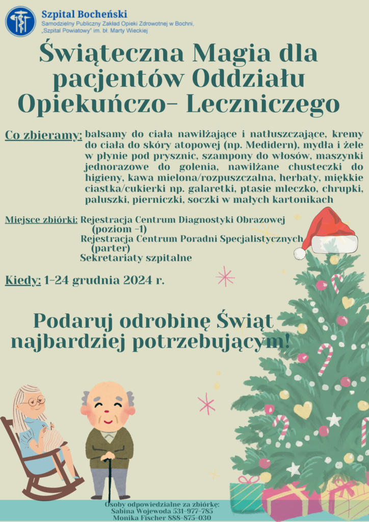 Zbliżają się Święta, czas dzielenia się, empatii oraz dobroci. W tym roku zapraszamy do włączenia się w wyjątkową akcję, której celem jest wsparcie pacjentów Oddziału Opiekuńczego-Leczniczego naszego Szpitala.