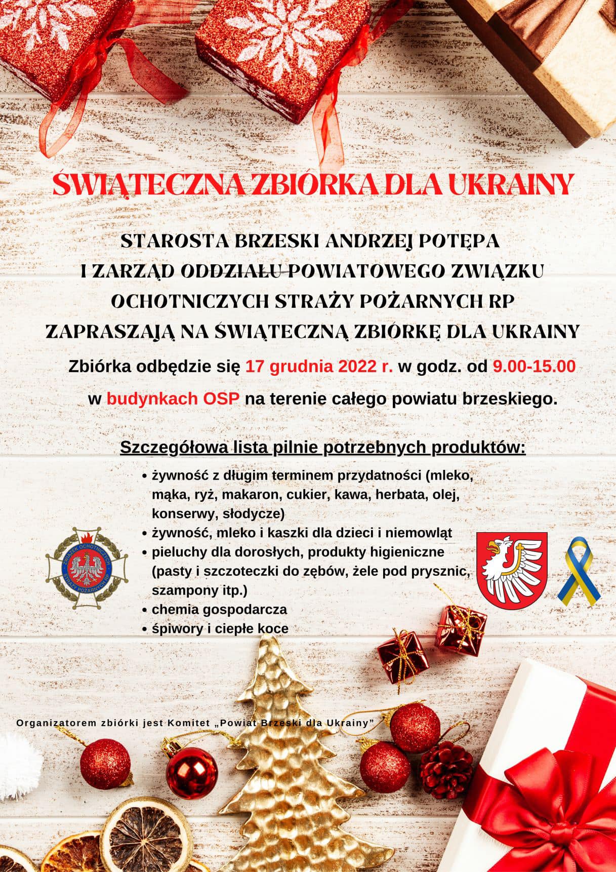 Wszyscy, którzy chcą wesprzeć ofiary wojny prosimy o dostarczenie darów w sobotę 17 grudnia 2022 r. do remiz OSP na terenie całego Powiatu Brzeskiego.