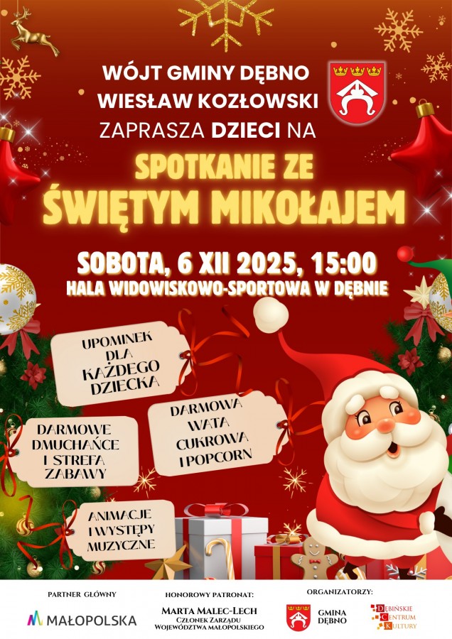 Wójt Gminy Dębno Wiesław Kozłowski zaprasza wszystkie dzieci na wyjątkowe Spotkanie ze Świętym Mikołajem, które odbędzie się w sobotę, 6 grudnia 2025 roku, o godzinie 15:00 w Hali Widowiskowo-Sportowej w Dębnie.