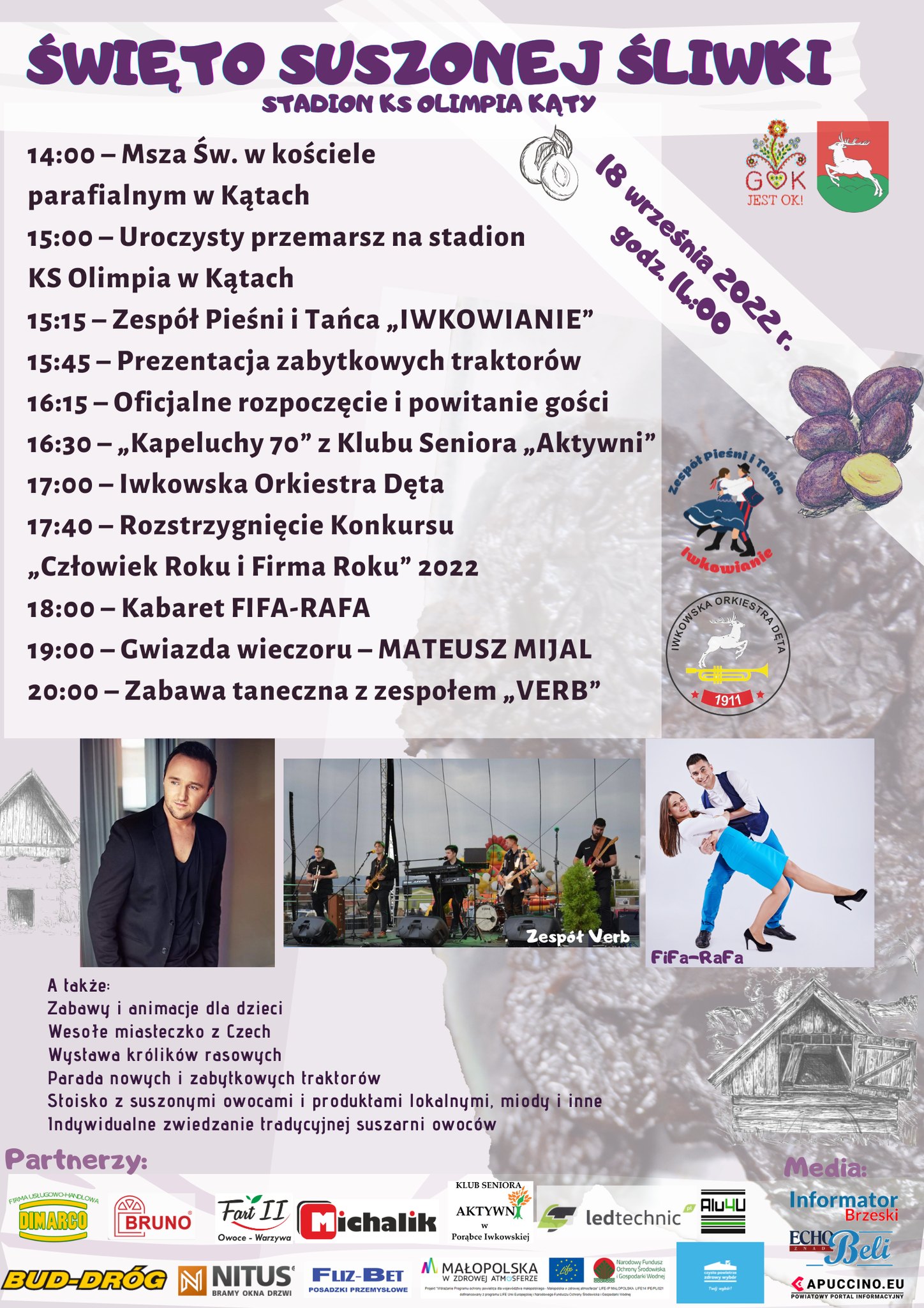 W niedzielę 18 września 2022 r. w Gminie Iwkowa odbędzie się kolejne Święto „Suszonej Śliwki”. Jak wskazuje sama nazwa święta najważniejszą rolę będzie grała w tym dniu śliwka. Tradycyjnie święto odbędzie się w miejscowości Kąty.