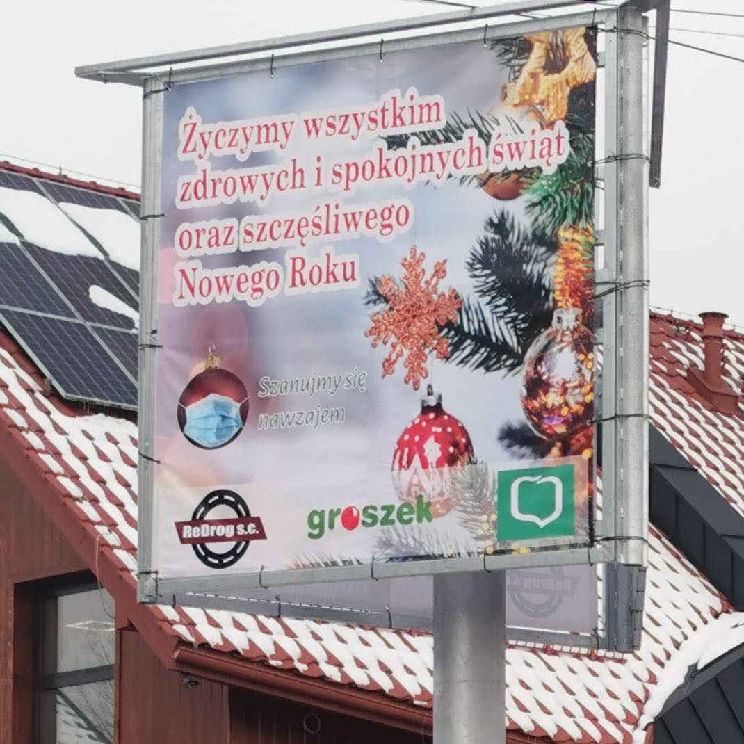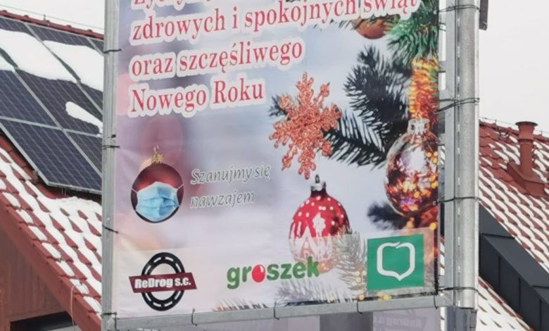 W centrum jednej z miejscowości Powiatu Brzeskiego na bilbordzie pojawiły z życzenia z okazji Bożego Narodzenia i Nowego Roku. Uwagę zwraca jedna ozdób – bombka choinkowa przybrana w maseczkę z dopiskiem „Szanujmy się nawzajem”.