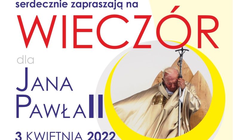 W niedzielę 3 kwietnia 2022 r. o godz.17:00 na sali widowiskowej GCKCziS odbędzie się “Wieczór dla Jana Pawła II”, poświęcony 17 rocznicy śmierci Ojca Świętego.