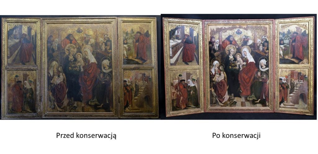 Przed rozpoczęciem prac stan tryptyku był alarmujący. Drewniane podobrazie zostało mocno osłabione przez drewnojady, a liczne ubytki zaprawy i warstwy malarskiej zniekształcały odbiór wizualny dzieła. Dodatkowo, dawne, niefachowe naprawy doprowadziły do pociemnienia i zżółknięcia powłok, a odwrocie środkowej części było zamalowane białą farbą.