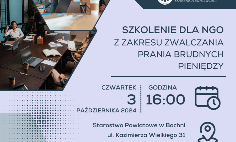 Starostwo Powiatowe w Bochni zaprasza przedstawicieli organizacji pozarządowych z terenu powiatu do udziału w szkoleniu dotyczącym przeciwdziałania praniu pieniędzy oraz finansowaniu terroryzmu, zgodnie z wymogami ustawy o przeciwdziałaniu praniu pieniędzy oraz finansowaniu terroryzmu. Wydarzenie to jest odpowiedzią na liczne wątpliwości i pytania pojawiające się wśród NGO’s, stowarzyszeń, OSP, klubów sportowych oraz fundacji, które mają obowiązek stosować się do przepisów tej ustawy.
