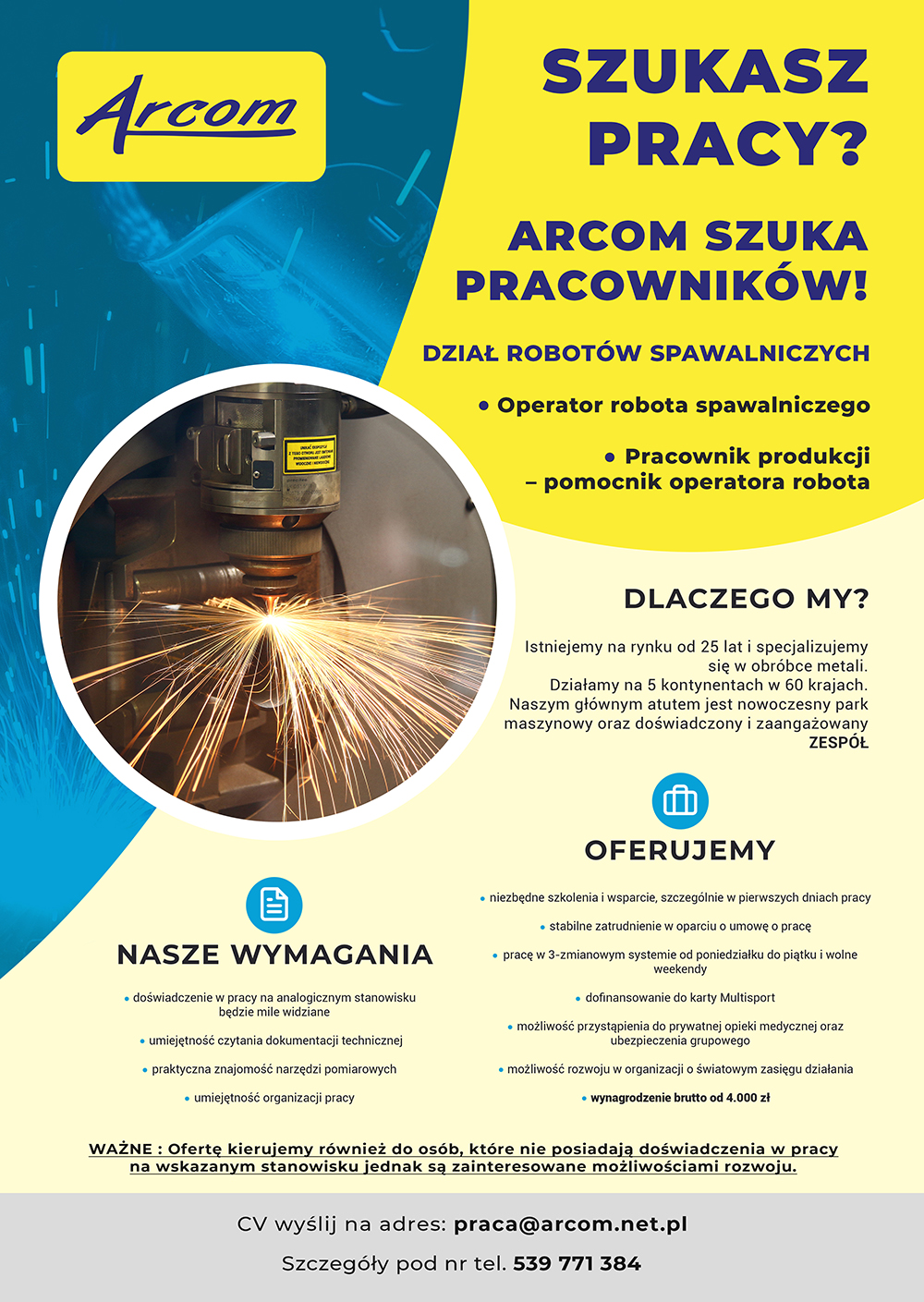 Zatrudniamy ponad 150 osób i nie zwalniamy tempa, dlatego też — może to właśnie TY zainteresujesz się jedną z naszych ofert i dołączysz do Zespołu Arcom: Szukamy obecnie: OPERATOR ROBOTA SPAWALNICZEGO, POMOCNIK PRODUKCJI / POMOCNIK OPERATORA ROBOTA