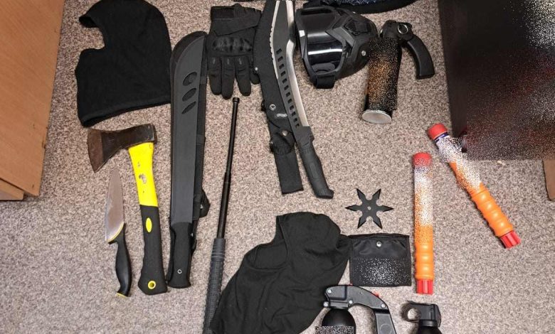Podczas patrolowania przy stadionie sportowym zauważyli Peugeota, w którym siedziało 5 osób. Policjanci od razu rozpoznali pseudokibiców przeciwnej drużyny. Pojazd został zatrzymany i wylegitymowano wszystkie przebywające w nim osoby. Byli to młodzi mieszkańcy naszego miasta, wśród których była również jednak osoba nieletnia. Przeszukanie osób oraz pojazdu, ujawniło niebezpieczne przedmioty w postaci gazów pieprzowych w pojemnikach o różnych wielkościach, pałkę teleskopową, maczety, nóż kuchenny, kominiarki, … a nawet mały toporek. Wszyscy trafili do komisariatu Policji przy ul. Narutowicza, gdzie zostały im odebrane wymienione przedmioty. Zostali rozpytani, a następnie zwolnieni, nieletni został przekazany opiekunom prawnym.