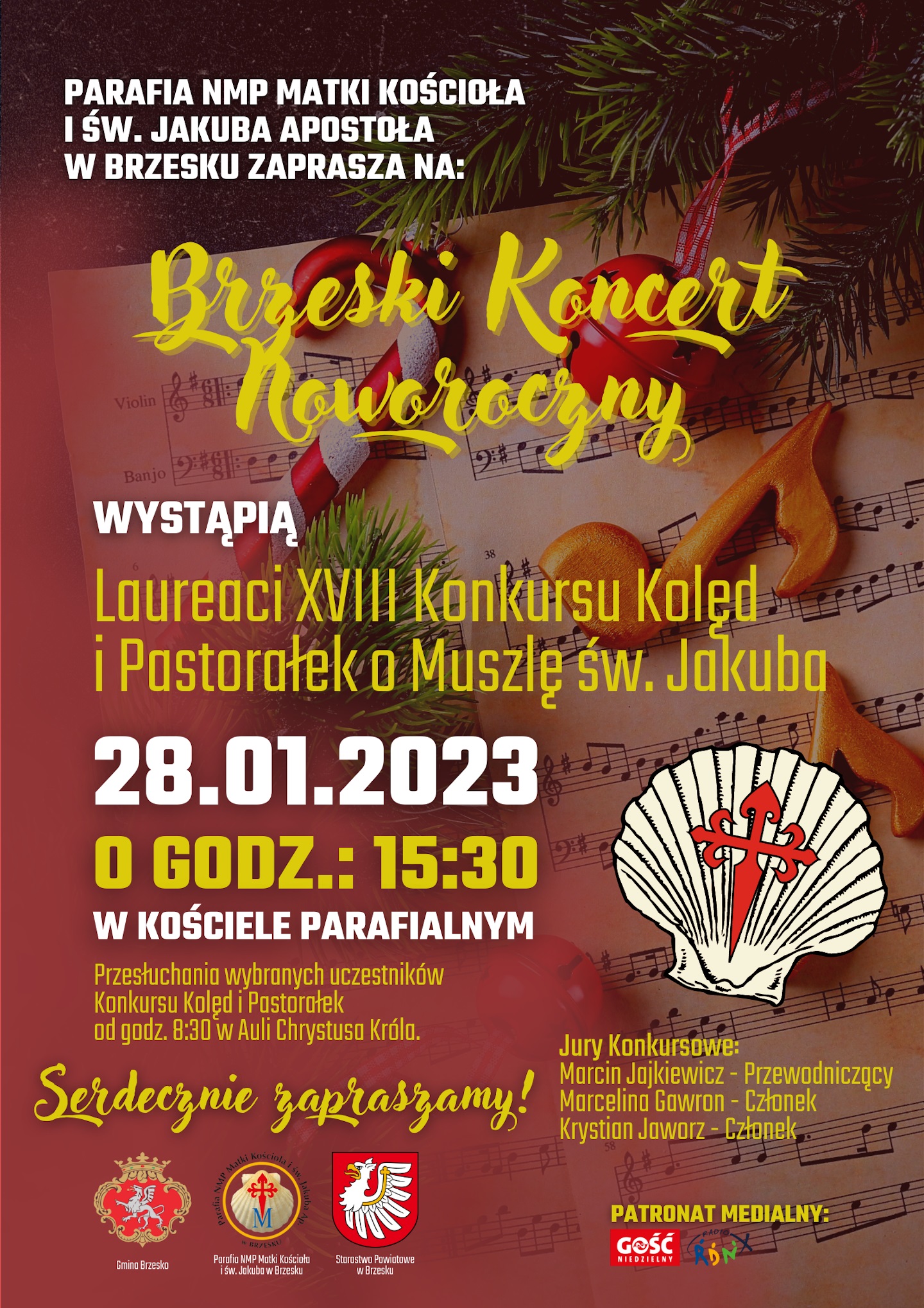 Już dzisiaj – 28 stycznia 2023 r. o godzinie 15.30 odbędzie się finał osiemnastej edycji Konkursu Kolęd i Pastorałek o Muszlę św. Jakuba. Podczas Brzeskiego Koncertu Noworocznego zaprezentują się laureaci konkursu.