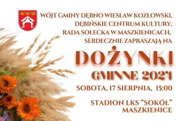 Wójt Gminy Dębno Wiesław Kozłowski, Sołtys z Radą Sołecką Maszkienic oraz Dębińskie Centrum Kultury serdecznie zapraszają na tegoroczne DOŻYNKI GMINY DĘBNO 2024, które odbędą się już 17 sierpnia 2024 na Stadionie LKS „SOKÓŁ” w Maszkienicach.