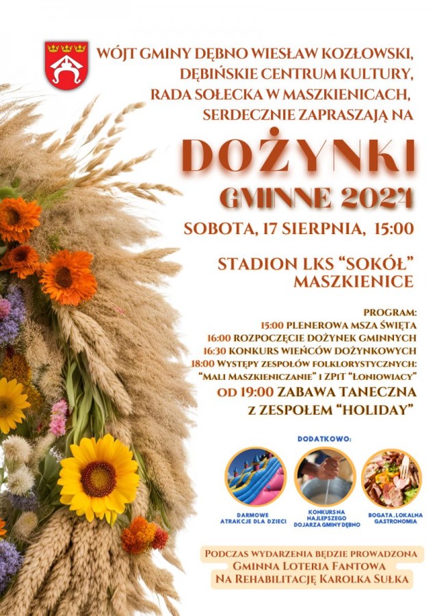 Wójt Gminy Dębno Wiesław Kozłowski, Sołtys z Radą Sołecką Maszkienic oraz Dębińskie Centrum Kultury serdecznie zapraszają na tegoroczne DOŻYNKI GMINY DĘBNO 2024, które odbędą się już 17 sierpnia 2024 na Stadionie LKS „SOKÓŁ” w Maszkienicach.