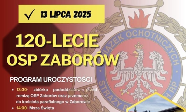 W niedzielę, 13 lipca 2025 roku, w Zaborowie (Gmina Szczurowa) odbędą się uroczystości z okazji 120-lecia istnienia Ochotniczej Straży Pożarnej. Obchody rozpoczną się o godzinie 13:30 zbiórką pododdziałów przed remizą, skąd uczestnicy przemaszerują do kościoła parafialnego na Mszę Świętą o godz. 14:00.