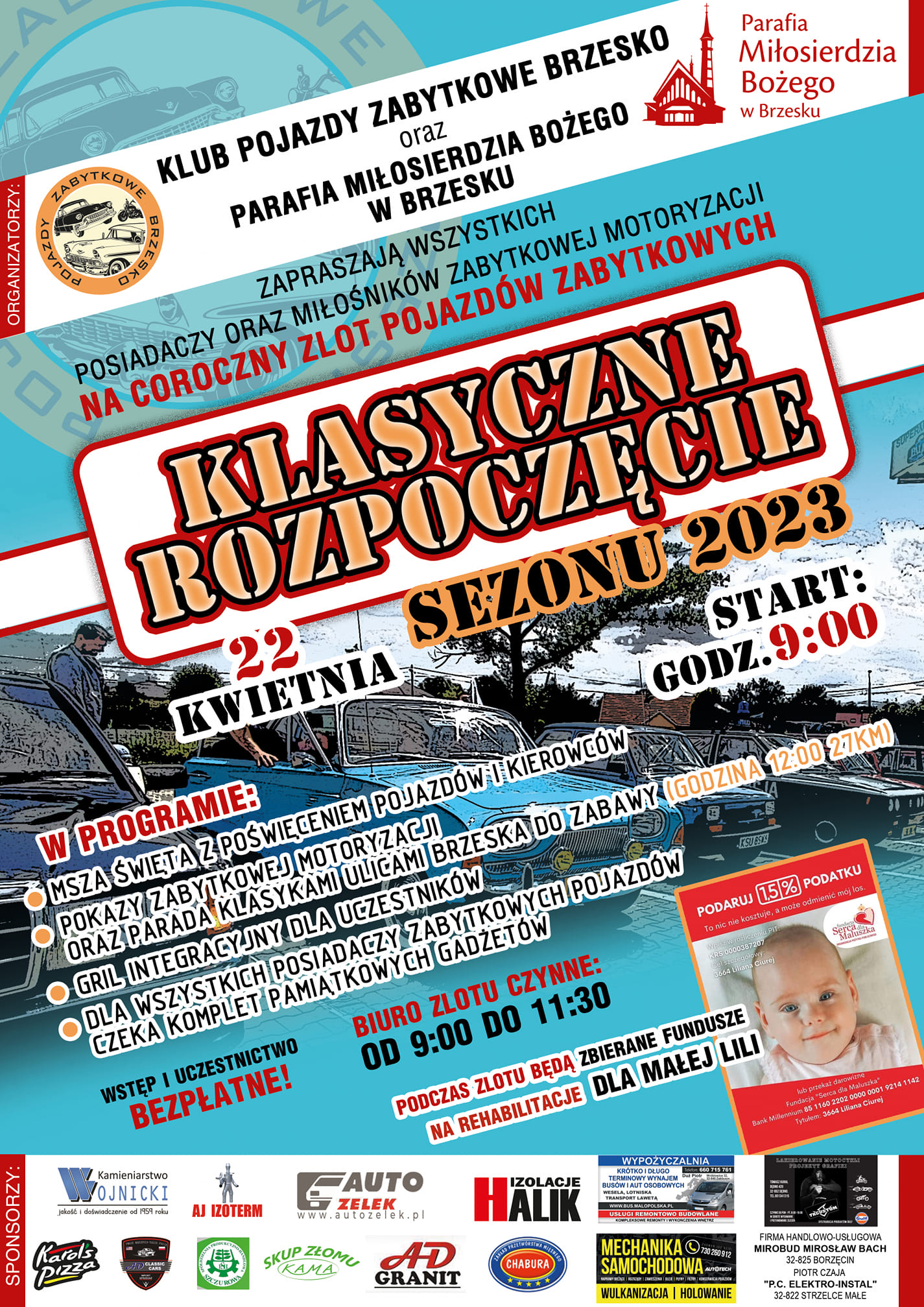 O godzinie 9.00 w sobotę 22 kwietnia 2023 r. na parkingu obok kościoła Miłosierdzia Bożego w Brzesku będziemy mogli podziwiać dziesiątki klasycznych samochodów oraz motocykli. Od wielu lat ekipa Pojazdy Zabytkowe Brzesko oraz Parafia pw. Miłosierdzia Bożego organizują zlot inaugurujący sezon dla wszystkich posiadaczy zabytkowych samochodów, oraz motocykli.