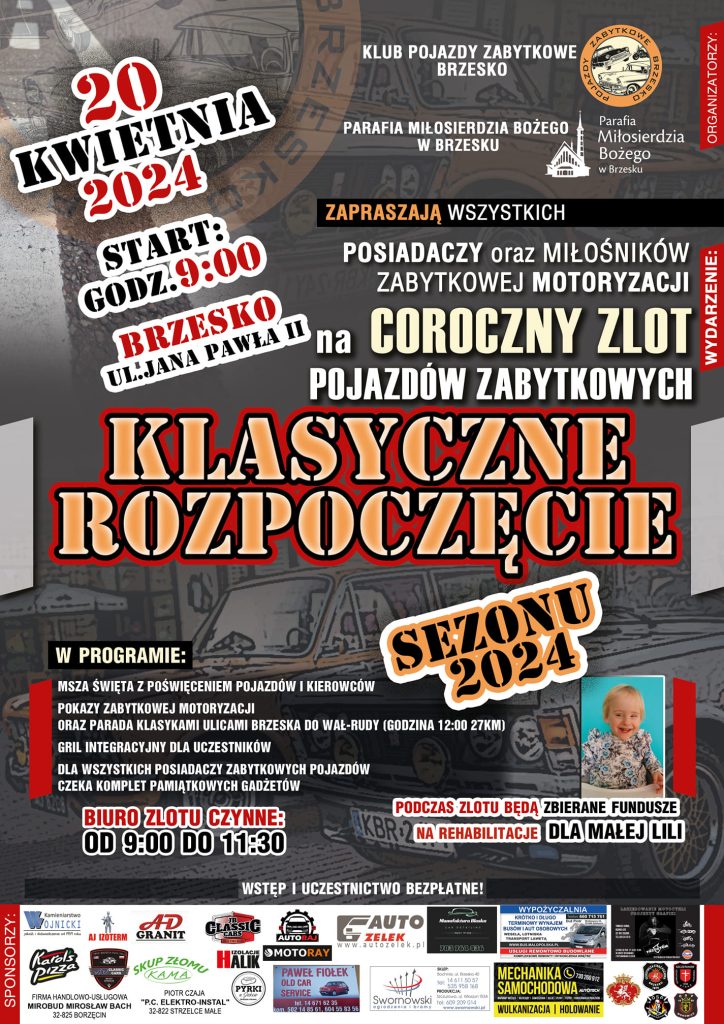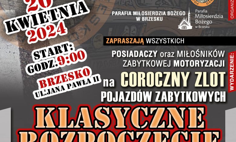 O godzinie 9.00 w sobotę 20 kwietnia 2024 r. na parkingu obok kościoła Miłosierdzia Bożego w Brzesku bedziemy mogli podziwiać dziesiątki klasycznych samochodów oraz motocykli. Od wielu lat ekipa Pojazdy Zabytkowe Brzesko oraz Parafia pw. Miłosierdzia Bożego organizują zlot inaugurujący sezon dla wszystkich posiadaczy zabytkowych samochodów oraz motocykli. Co roku liczba pojazdów rośnie – w 2023 r. było to prawie 400 samochodów i motocykli. Organizatorzy zachęcają uczestników do udziału w corocznej akcji charytatywnej towarzyszącej zlotowi.