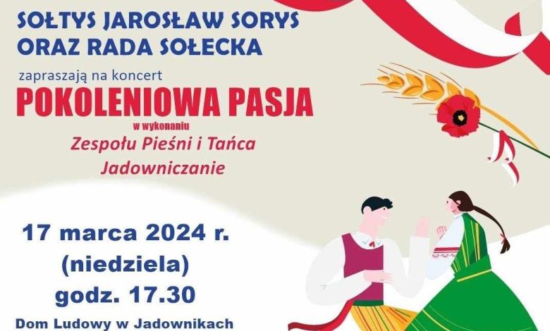 Z przyjemnością zapraszamy na koncert Zespołu Pieśni i Tańca „Jadowniczanie”, który odbędzie się w niedzielę 17 marca 2024 r. o godzinie 17:30 w Domu Ludowym w Jadownikach. To będzie niezapomniany wieczór pełen radości, tańca i wspólnego uczestnictwa w muzyce ludowej!