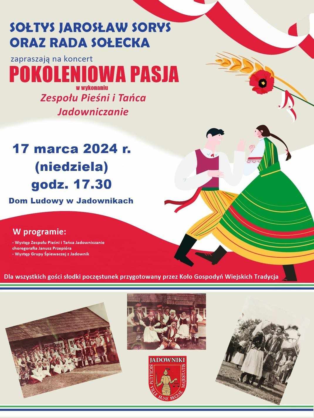Z przyjemnością zapraszamy na koncert Zespołu Pieśni i Tańca „Jadowniczanie”, który odbędzie się w niedzielę 17 marca 2024 r. o godzinie 17:30 w Domu Ludowym w Jadownikach. To będzie niezapomniany wieczór pełen radości, tańca i wspólnego uczestnictwa w muzyce ludowej!