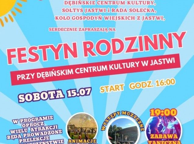 Wójt Gminy Dębno Wiesław Kozłowski, Dębińskie Centrum Kultury, Sołtys wraz z Radą Sołecką wsi Jastew oraz KGW „Jastwianki” serdecznie zapraszają na Festyn Rodzinny przy Dębińskim Centrum Kultury w Jastwi.