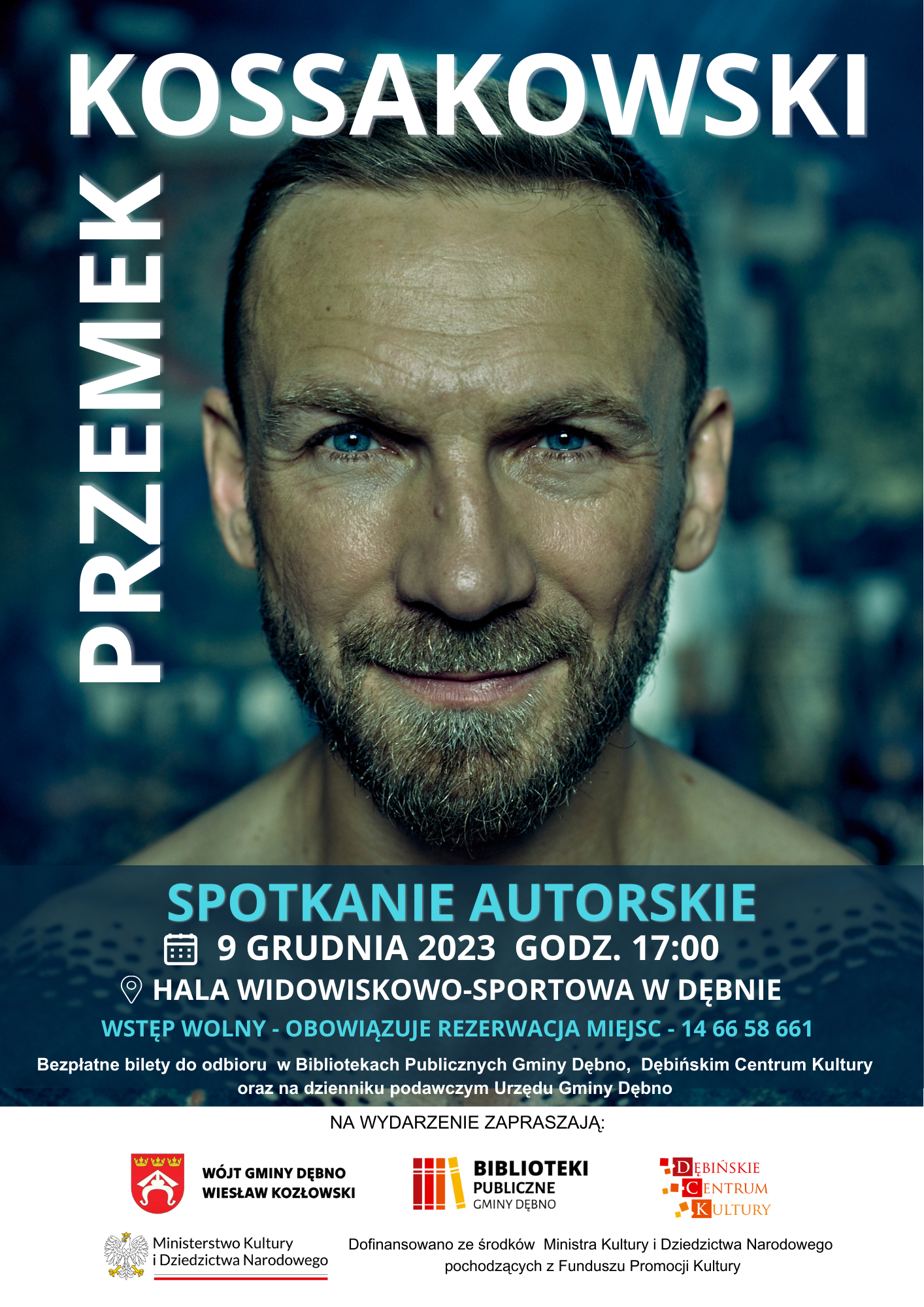 Wójt Gminy Dębno Wiesław Kozłowski, Biblioteki Publiczne Gminy Dębno i Dębińskie Centrum Kultury serdecznie zapraszają na spotkanie autorskie z Przemysławem Kossakowskim!