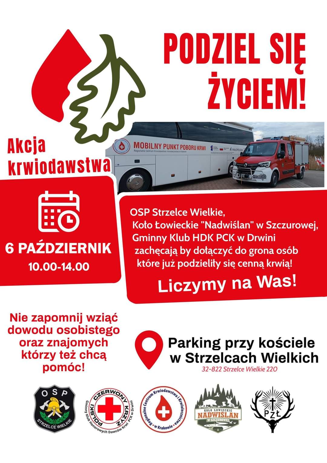 Ochotnicza Straż Pożarna Strzelce Wielkie, Koło Łowieckie „Nadwiślan” Szczurowa, Gminny Klub Honorowych Dawców Krwi Polskiego Czerwonego Krzyża w Drwini przypominają o ostatniej w tym roku akcji krwiodawstwa. Będzie to okazja do degustacji bigosu po myśliwsku (podobno bardzo dobrego), przygotowanego przez Koło Łowieckie.